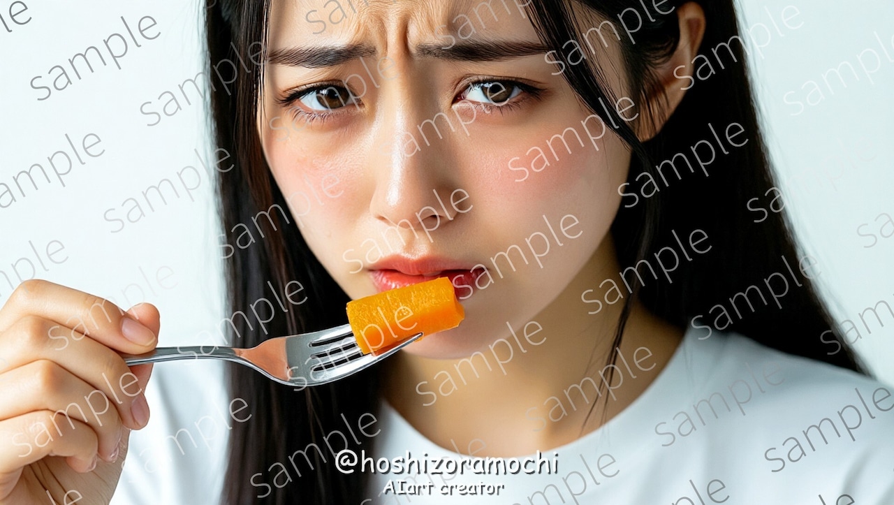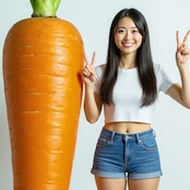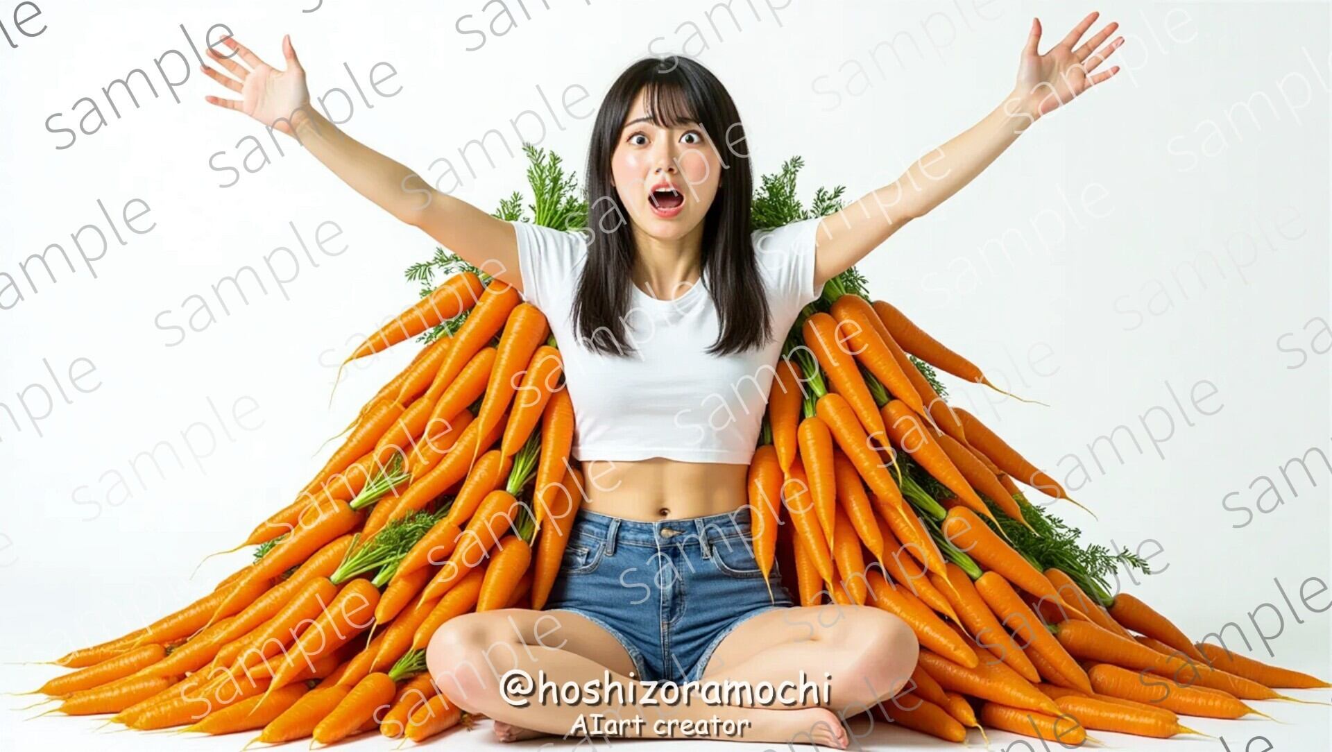 日本人女性と人参が織りなす、洗練されたビジュアル表現。極限まで要素をそぎ落とした白背景が、被写体の存在を際立たせます。