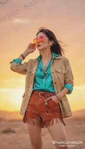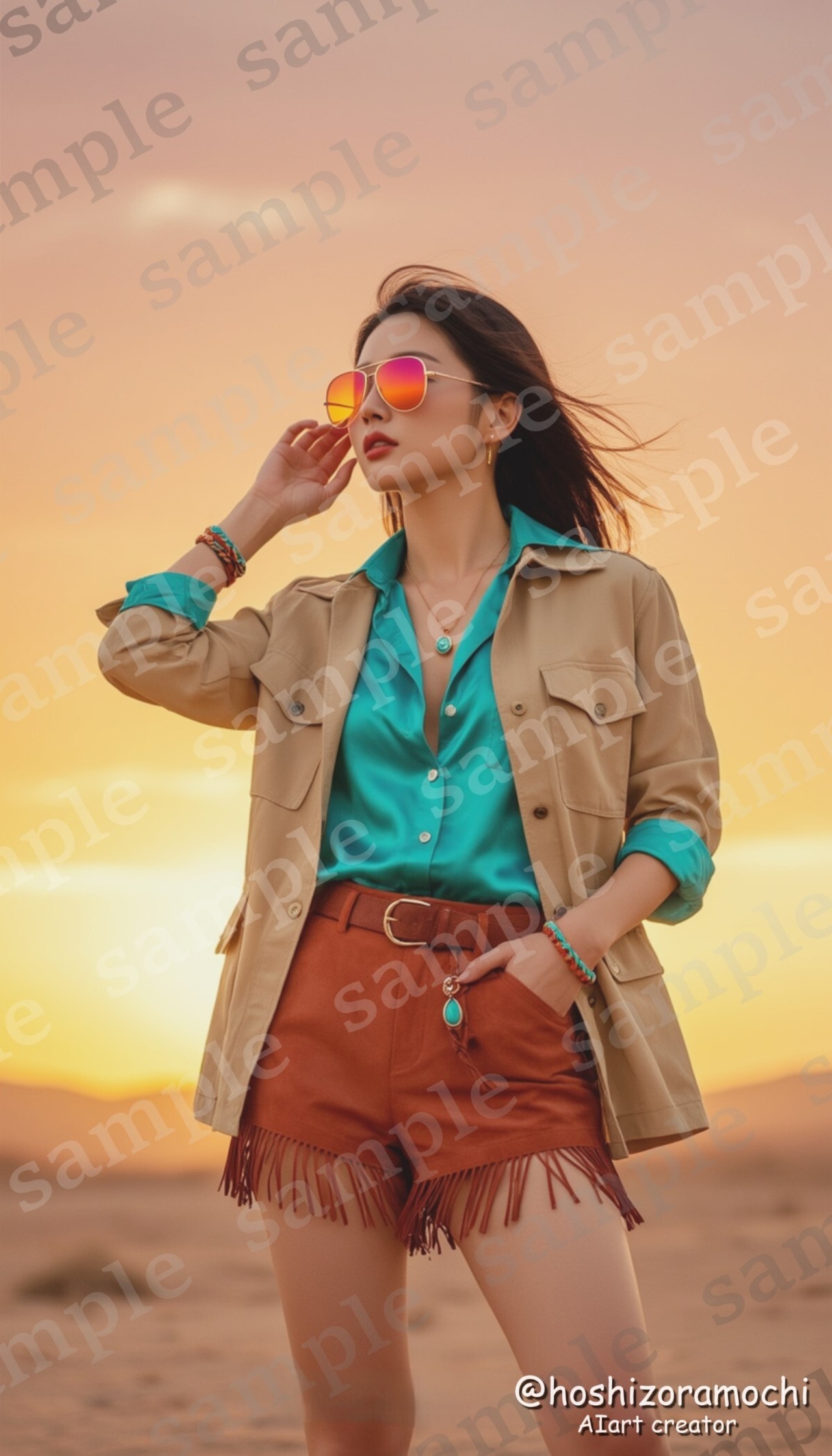 砂埃や夕日の光を細かく調整し、自然な逆光を表現。ローズゴールドのサングラスに温かみのある光を反射。冒険心、憧れ、遠い場所への想い、ロマンティックな憂い。