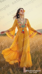 夕暮れの柔らかい光と、ドレスが広がる動きの表現。温かみのあるトーンで全体を統一。詩的な感動、静かな幸せ、自然への感謝、内面の豊かさ。