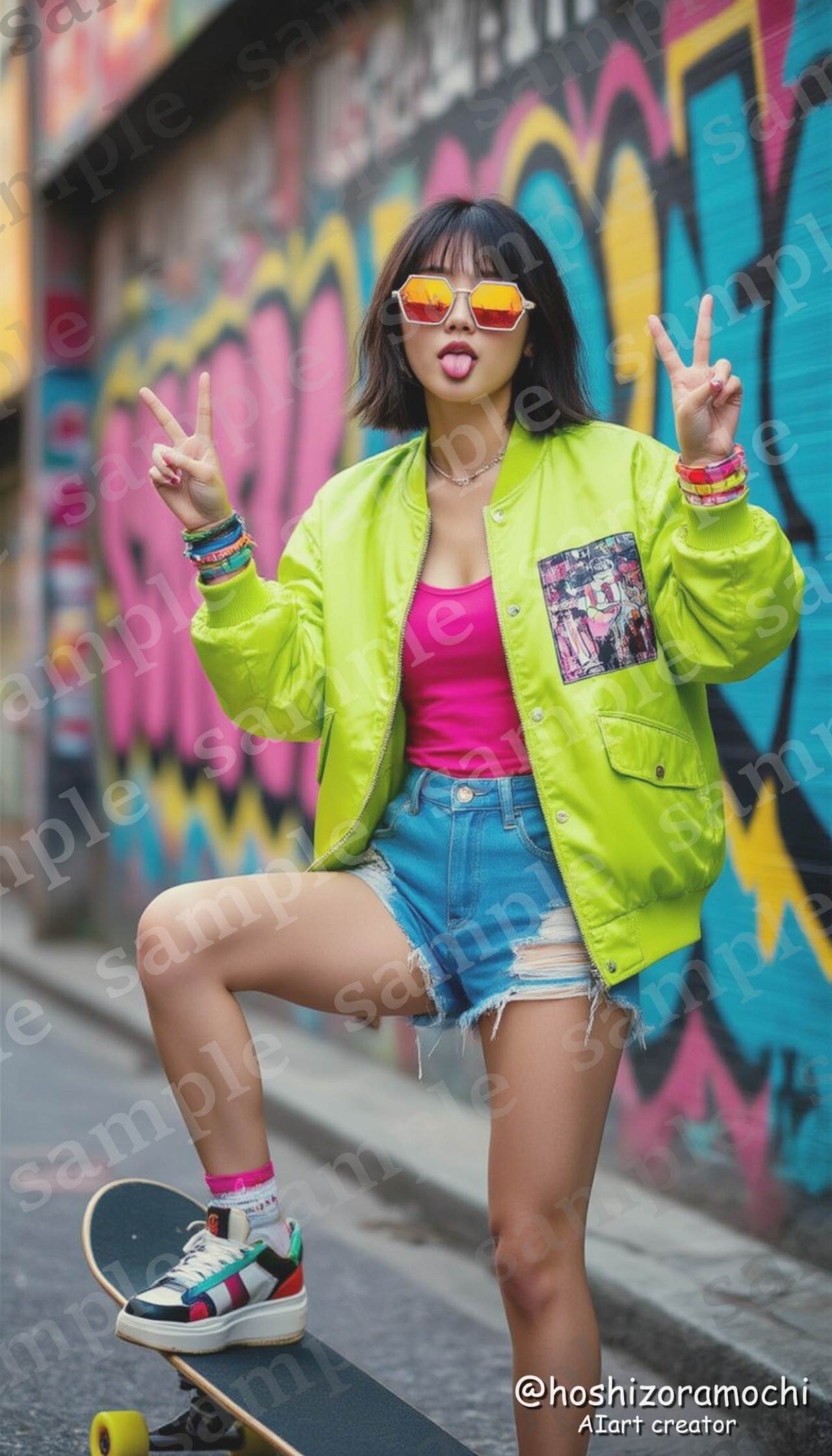 この作品は「完全にAI任せ」ではありません。ポーズ、色彩、構図、表情、サングラスの形状、アクセサリー、背景、光の当たり方――すべてのプロンプト(指示文)を手作業で丁寧に作成し、何度も調整を重ねています。