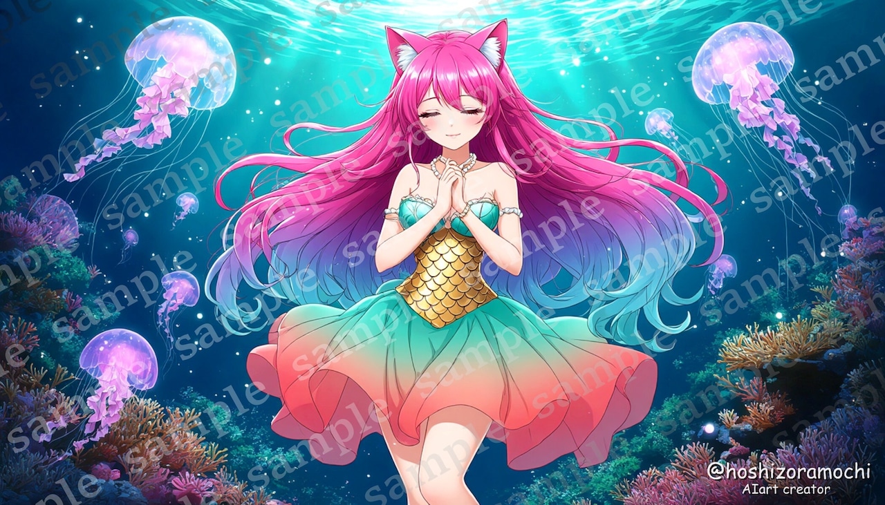水中特有の光の屈折と浮遊感を再現するため、髪と衣装の流体シミュレーション的な動きを重視。青緑系の神秘的ライティングで深海の静謐さを表現しています。静寂・神秘性・内省・心の平穏。