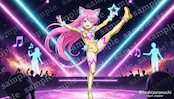 ジャンプの瞬間を捉えたローアングル構図で、アイドルの輝きと観客の視点を再現。レーザー光線とホログラム投影で宇宙規模のステージを表現しています。高揚感・希望・憧れ・キラキラした感動。