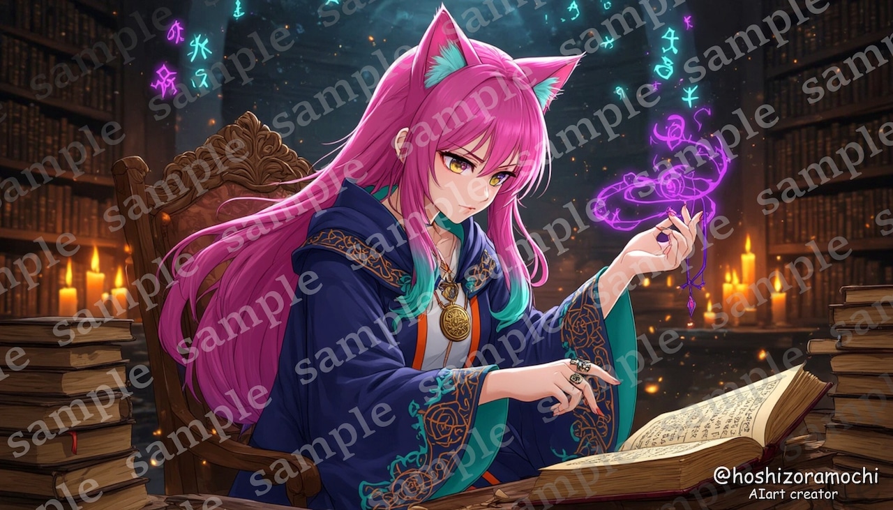 横顔の陰影処理で知性と集中力を表現。魔法文字の発光エフェクトとろうそくの暖色照明のコントラストで、神秘的かつ学術的な雰囲気を演出しました。知的好奇心・探求心・集中・神秘への憧れ。