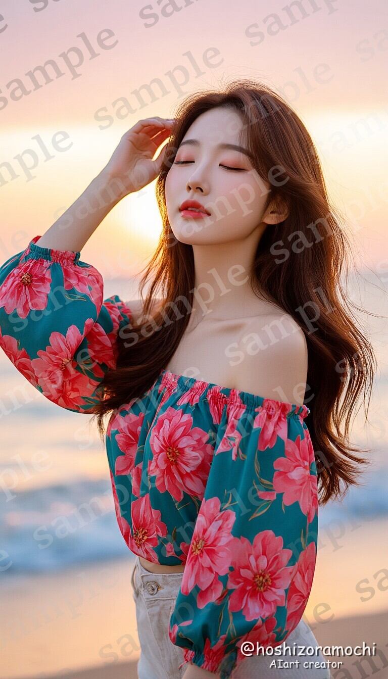 コーラルピンクとティールブルーの花柄が華やかなオフショルダーブラウス。ビーチの夕暮れ、自由で解放的な雰囲気。トラベルコンテンツ、リゾート関連、夏のプロモーション素材として最適。開放感と女性らしさを表現できます。