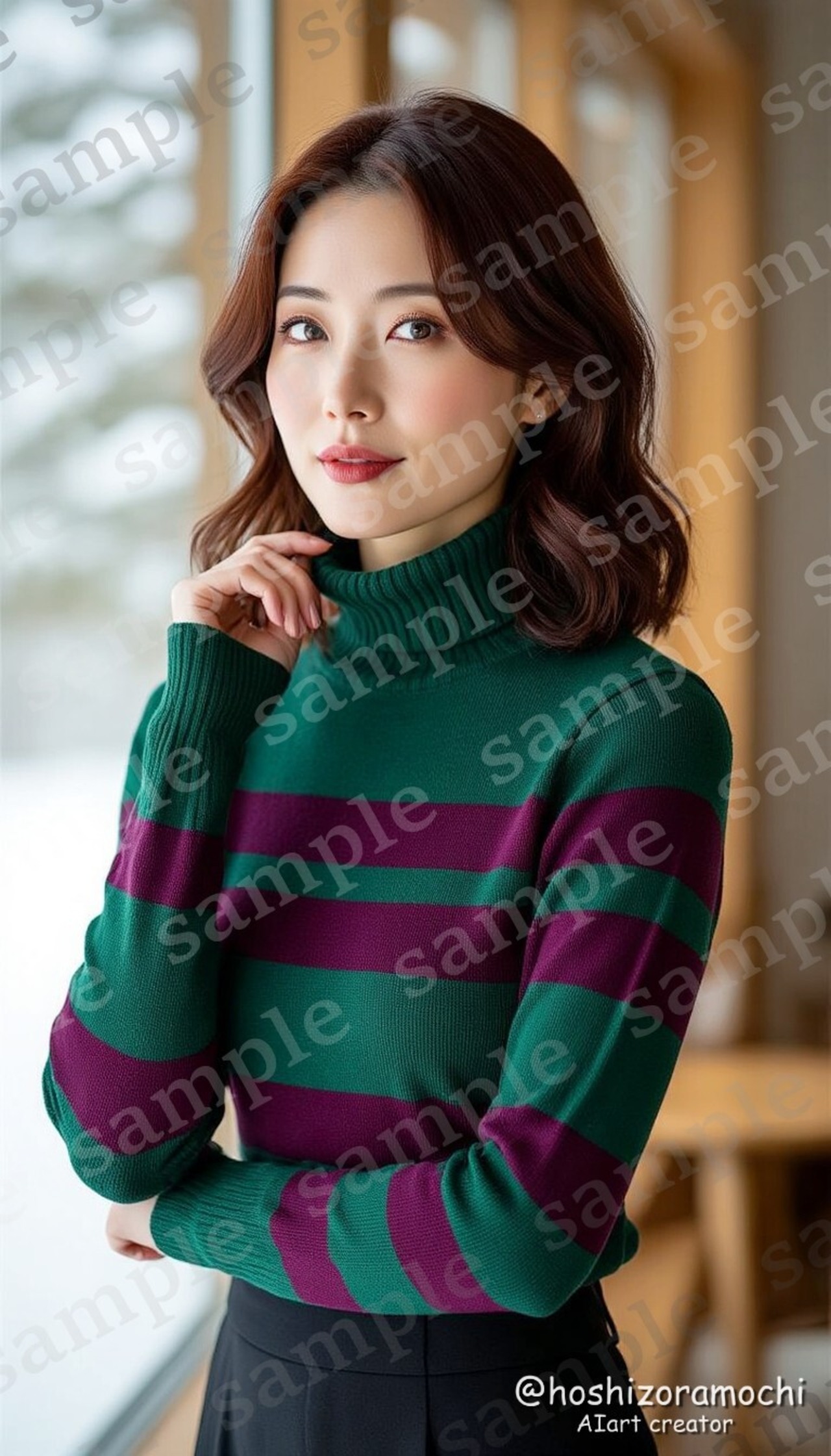 エメラルドグリーンとプラムパープルの横縞が洗練された印象のタートルネックニット。冬の温かみと知的な雰囲気を併せ持つ作品。ライフスタイル誌風の上品なビジュアルが必要な時に活躍します。