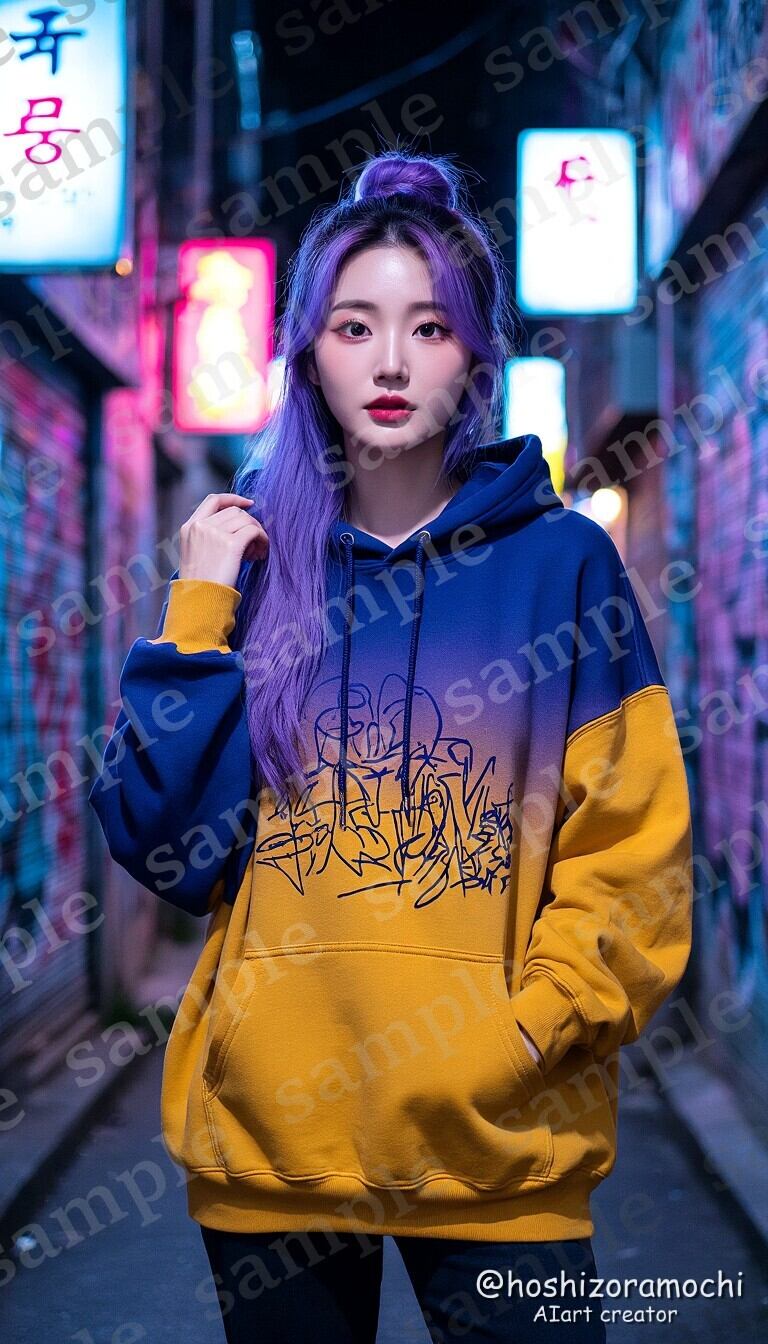インディゴブルーとマスタードイエローのグラデーションが美しいオーバーサイズパーカー。夜の都会の雰囲気、ストリートカルチャー、クリエイティブな世界観を表現。ファッションブログやアーバンライフスタイルのコンテンツにマッチします。