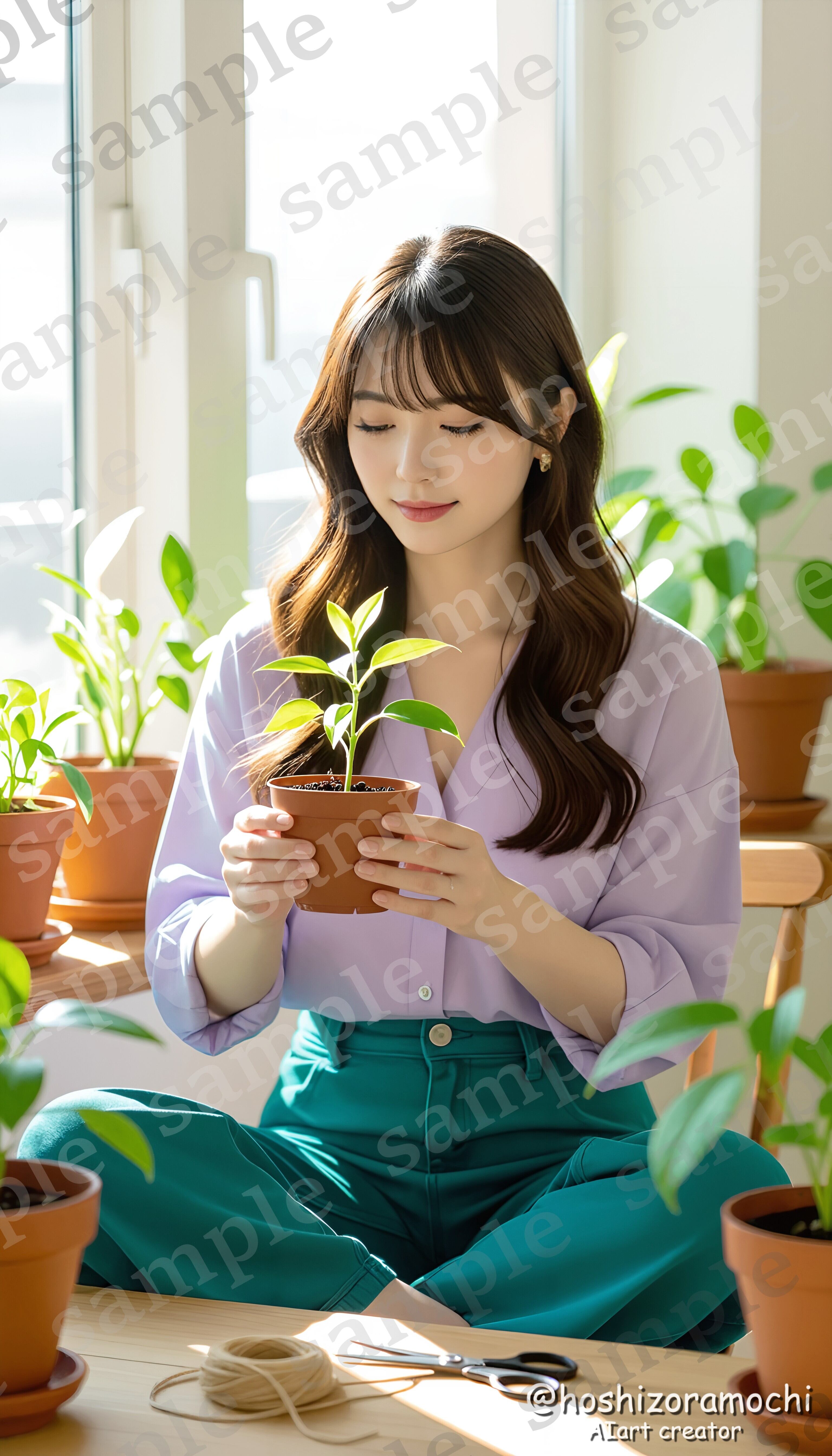 午後の柔らかな光の中、鉢植えの手入れをする落ち着いた雰囲気の作品です。ソフトラベンダーの七分袖シャツと深いティールブルーのガウチョパンツの組み合わせが、優雅で穏やかな時間を演出しています。植物の葉を優しく持ち上げて剪定する繊細な手の動き、窓から差し込む午後の光が作り出すレンブラント照明のような陰影が、この作品の見どころです。