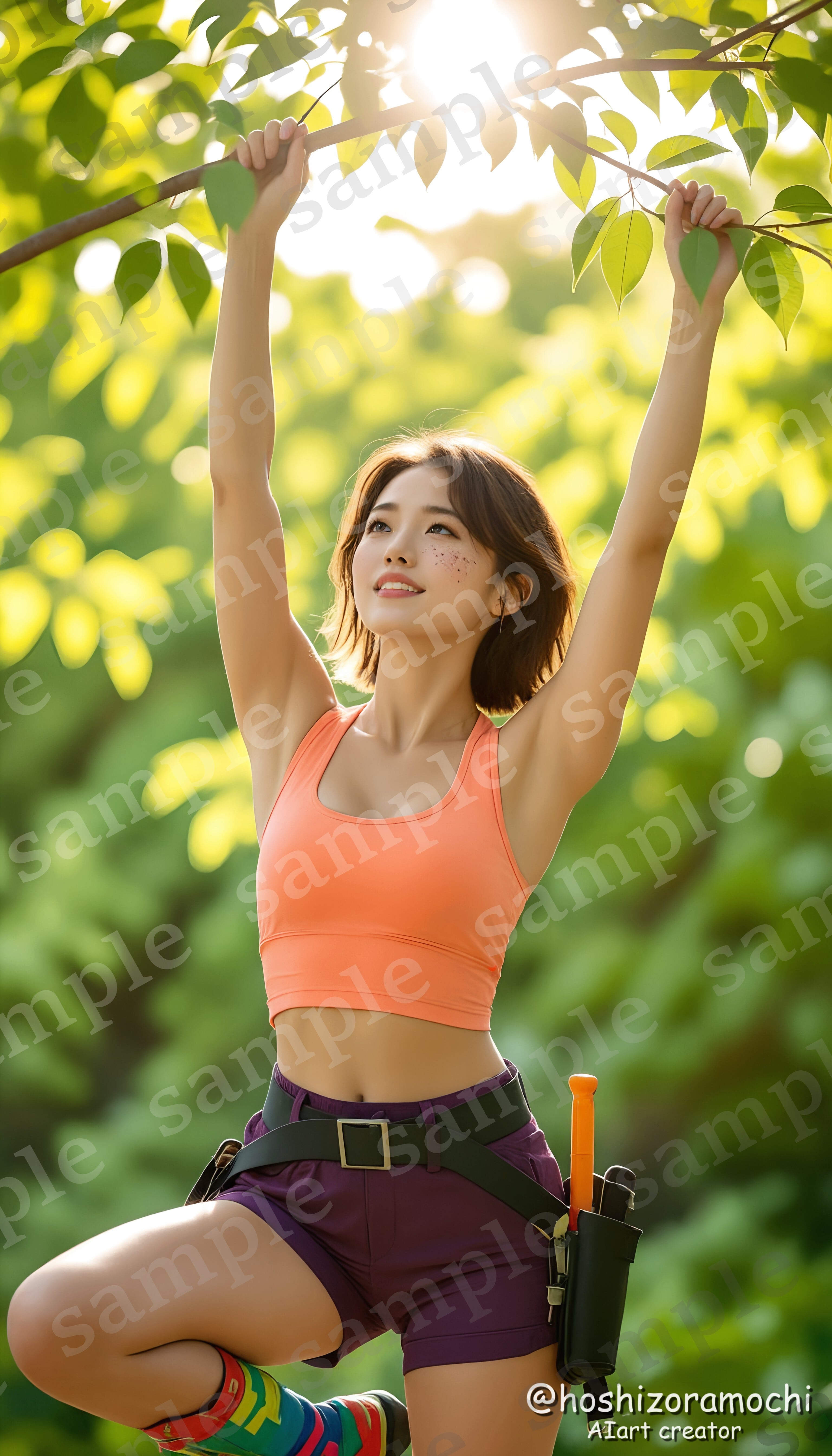 背伸びをして高い枝に手を伸ばす、アクティブで元気いっぱいの瞬間を切り取りました。アプリコットオレンジのタンクトップとプラムパープルのショートパンツという明るい配色が特徴です。ローアングルから見上げる構図で、楽しそうな表情から、ガーデニングを全身で楽しんでいる様子が伝わります。