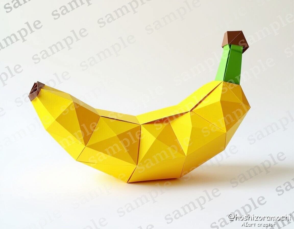 幾何学的な折り目とシャープなエッジが特徴的な、紙で制作されたバナナ。立体感と精密さを両立した、アート性の高い一枚です。クリエイティブな印象を与えたい場面に最適です。