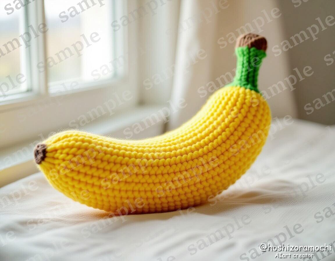毛糸で丁寧に編まれたバナナのぬいぐるみ。モコモコとした質感と温かみのある色合いが、見る人の心を和ませます。秋冬シーズンのコンテンツに特におすすめです。
