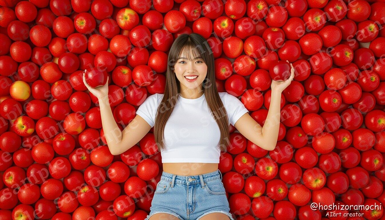 ミニマリストな純白の背景に、赤いりんごと白いTシャツ・デニムショーツ姿の女性が織りなす10のシーン。シンプルだからこそ際立つ、りんごの鮮やかな赤と女性の自然な表情。