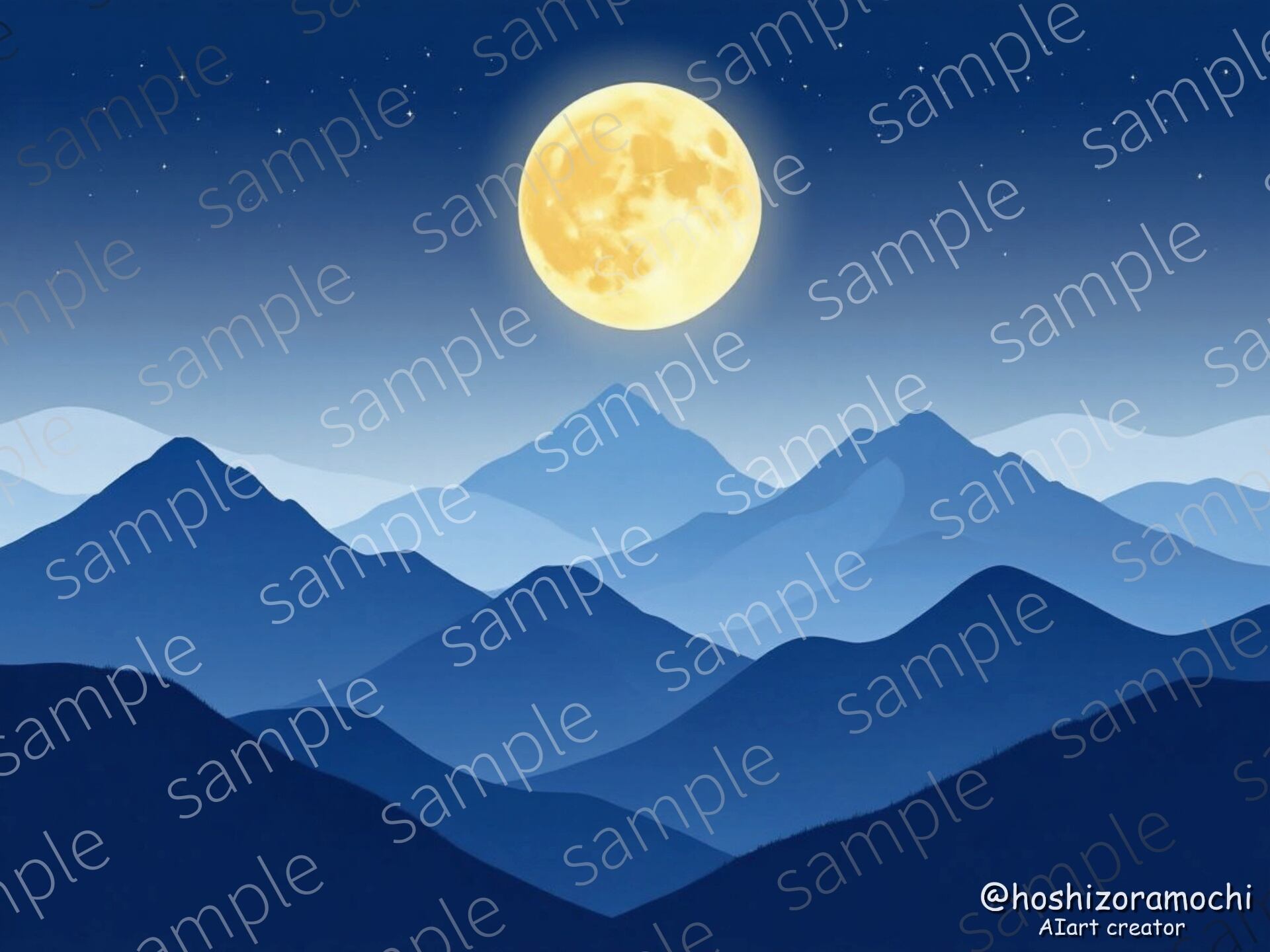 深いミッドナイトブルーからインディゴへ変化する夜空を背景に、幾重にも重なる山並みと満月を配した静謐な風景。遠近感を生み出す層構造が空間に奥行きをもたらします。