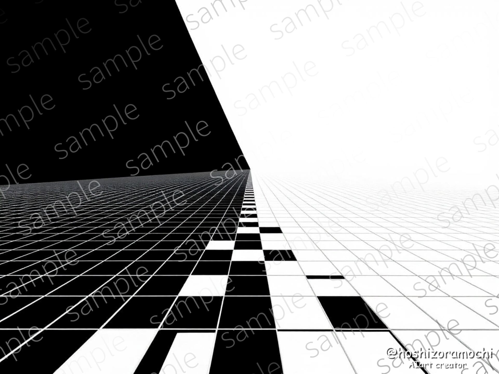 モノクロームの精密な格子状グリッドパターンに意図的なエラー表現を加えた幾何学作品。完璧さと不完全さの共存が、デジタル時代の美学を体現しています。