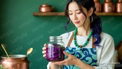 ディープネイビーブルーとエメラルドグリーンのウェーブヘアに、インディゴブルーとミントグリーンの波模様エプロン。発酵瓶を丁寧に抱える31歳の発酵食品研究家。時間をかけて食材を変化させる発酵の奥深さを伝える、落ち着いた雰囲気のキャラクター。
