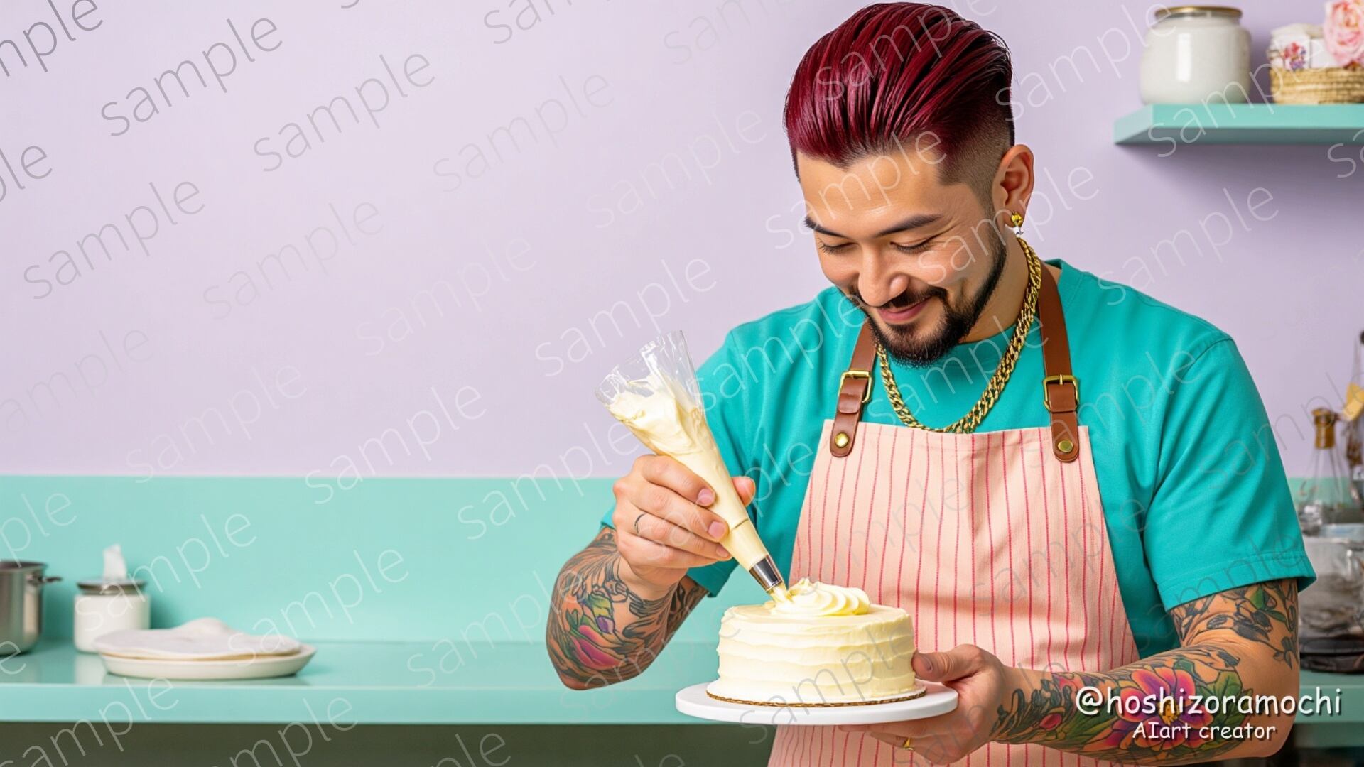 ワインレッドの短髪に整えられた髭、両腕に広がるオレンジと紫のフラワータトゥーが特徴的な32歳のパティシエ。ターコイズブルーとサーモンピンクのストライプエプロンを着用し、クリーム絞り袋を持つ繊細な手つき。見た目と作る菓子のギャップが魅力のキャラクター。