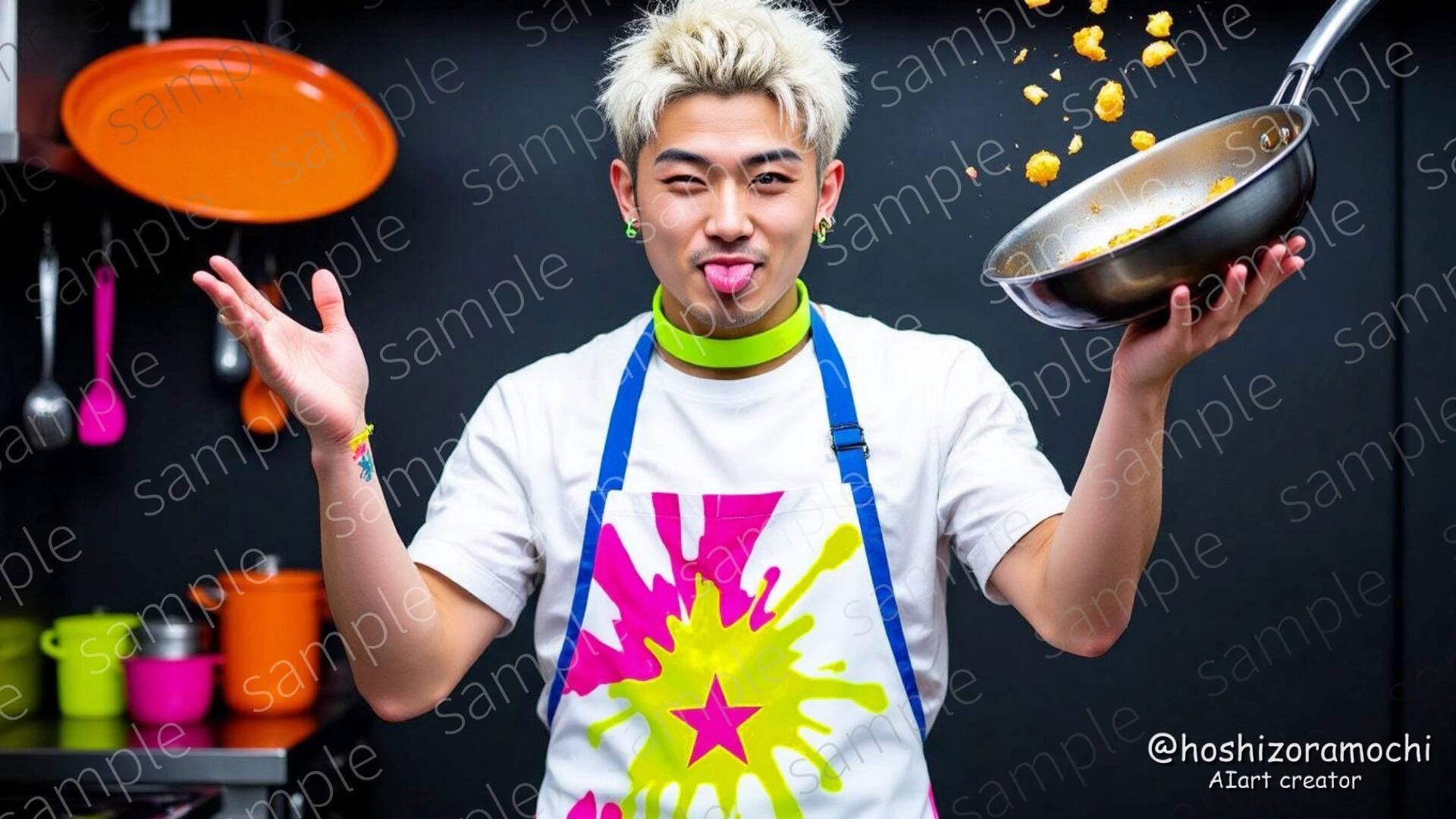 真っ白に脱色したショートヘアに、純白エプロンへの蛍光ピンクとイエローのペイントスプラッシュ。フライパンで料理を宙に投げる瞬間を捉えた22歳の朝食専門料理人。Z世代のエネルギーと革新性を体現し、朝食に新しい価値を提案するキャラクター。