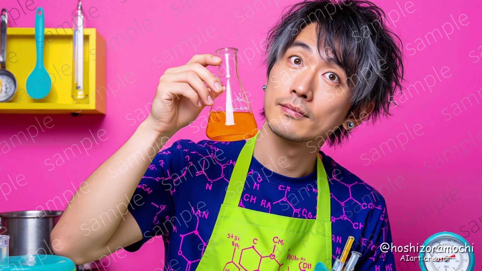 アッシュグレーとエレクトリックパープルのメッシュヘアに、ライムグリーンと化学式プリントのエプロンを着用した29歳の料理科学者。ビーカーとスポイトを持ち、料理を分子レベルで分析する真剣な表情。科学的根拠に基づいた料理を追求するキャラクター。