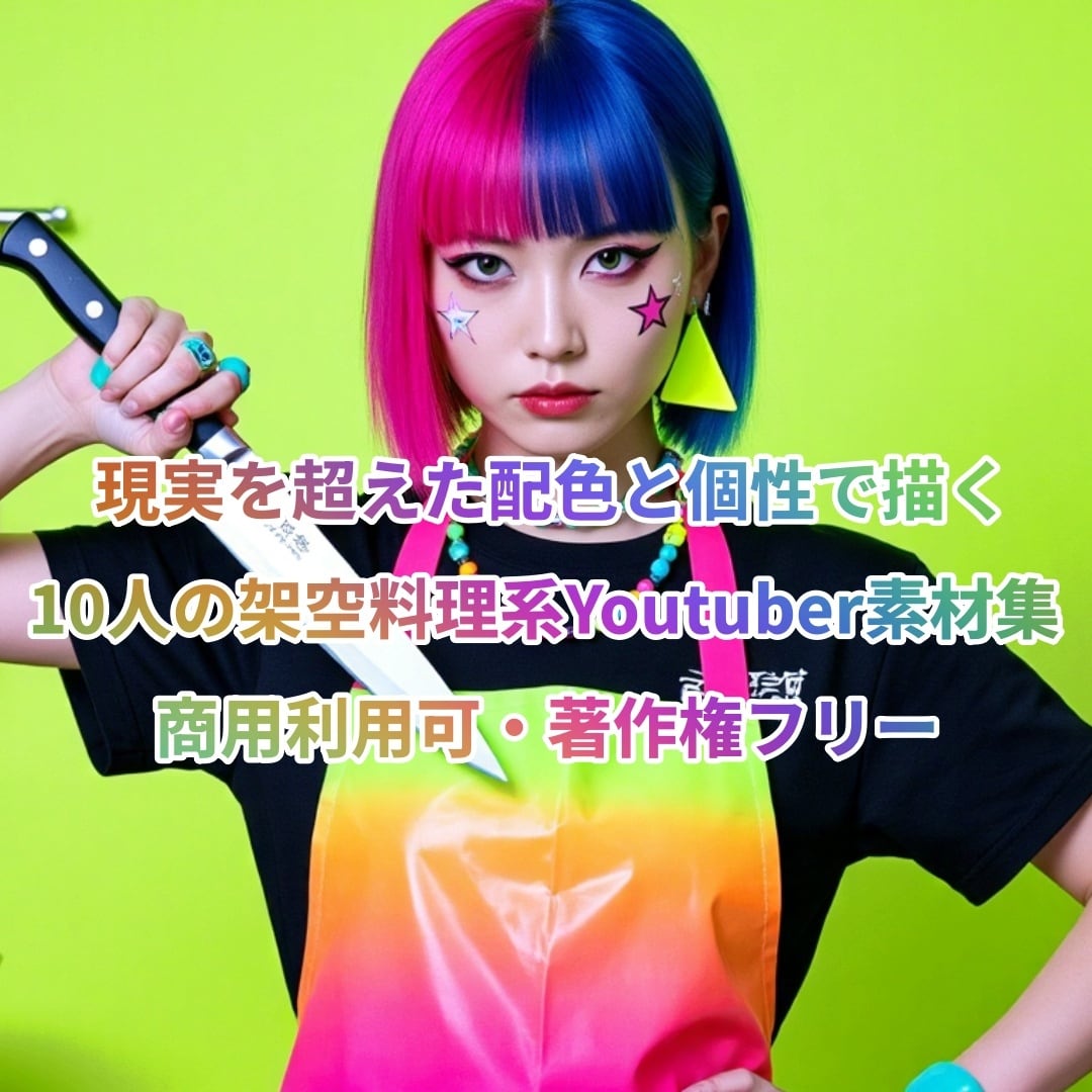 AI画像生成技術を駆使して制作した、架空の料理系Youtuber10人のキャラクターイラスト素材集です。