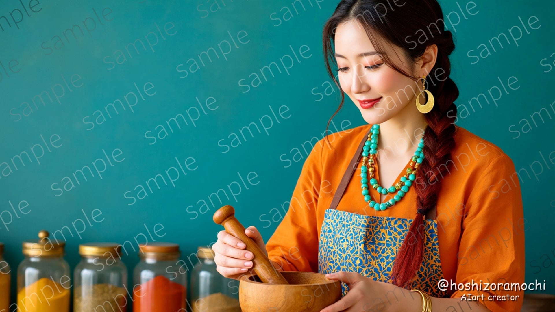 バーントオレンジから深紅へと変化するグラデーションヘアに、アプリコットオレンジとコバルトブルーの幾何学模様エプロン。乳鉢でスパイスをすりつぶす34歳の料理研究家。世界中を旅して集めたスパイスで独自の料理を創作するキャラクター。