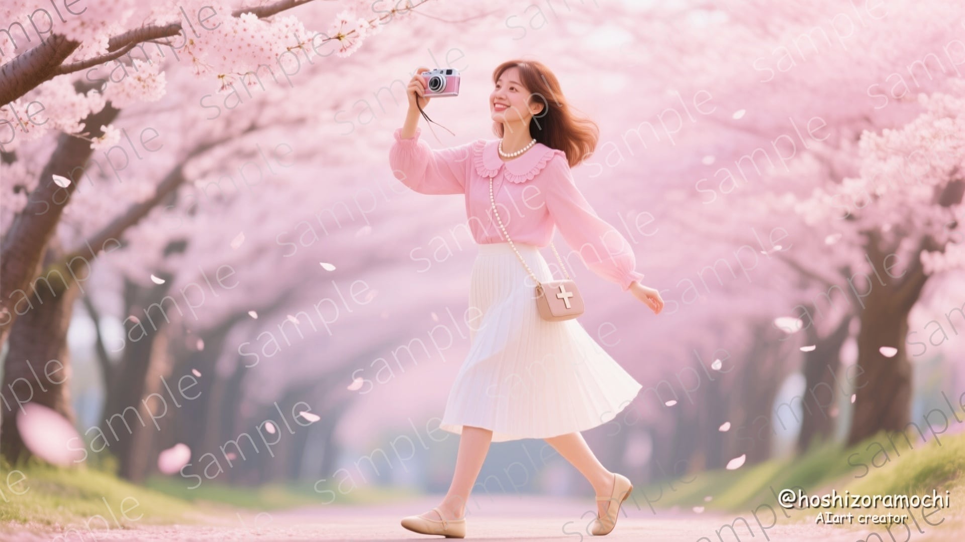 満開の桜の木の下を歩きながら、コンパクトデジカメを目の高さに掲げて桜の枝を撮影する女性。ふんわりとしたセミロングの茶色い髪に桜の花びらが舞い落ち、パステルピンクのブラウスに白いプリーツスカートという春らしいスタイル。歩く動きでスカートが揺れ、片足が地面から離れかけている瞬間を捉えました。柔らかい春の自然光で温かみのあるトーンです。