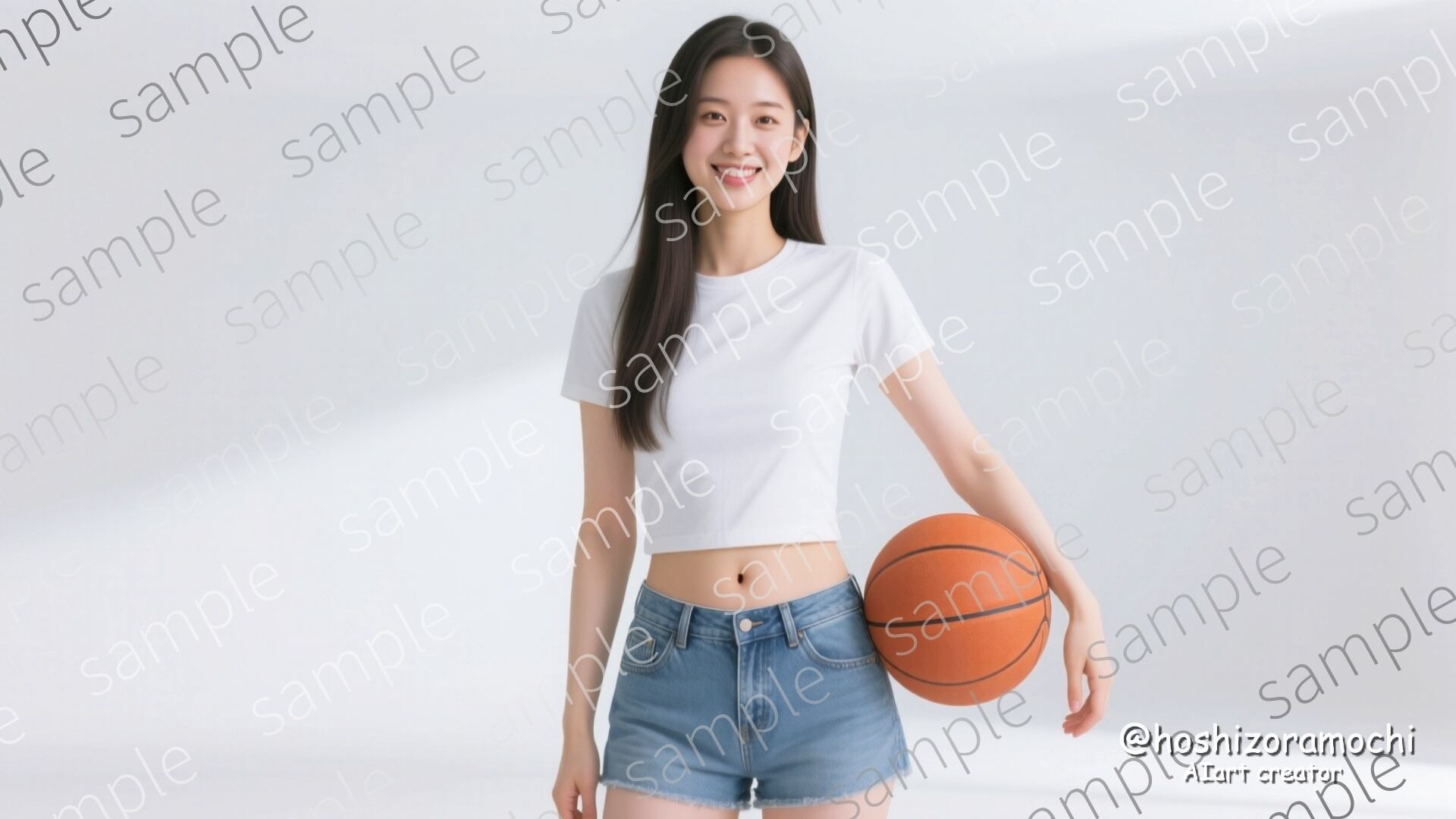 腰の横でバスケットボールを片手持ちする女性。穏やかな微笑みと自信に満ちた視線。オレンジ色のボールが白い空間の中で唯一の鮮やかなアクセントとなり、静止した躍動感を表現しています。