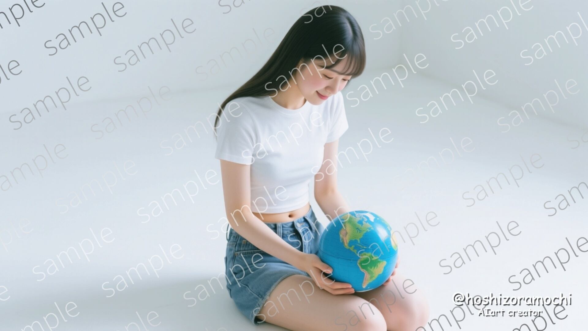 膝の上に地球の模型を置き、両手で支える女性。思索的で穏やかな表情。青と緑の地球儀が保護と責任、希望を象徴しています。
