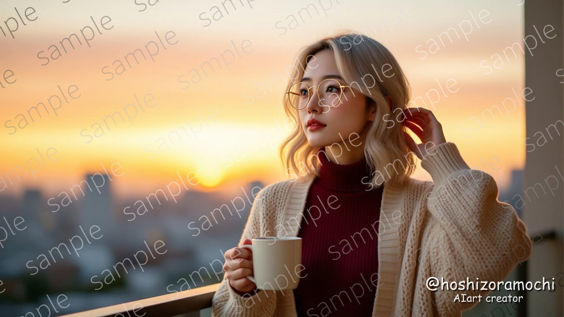 都市の高層マンション、朝焼けがオレンジとピーチピンクに染まる空。ゴールドフレームの丸メガネをかけた女性が、マグカップを持ちながら遠くを見つめる。プラチナブロンドの髪、クリームベージュのニット、バーガンディのタートルネック。逆光によるリムライトが、朝の静けさと物思いにふける心情を表現。