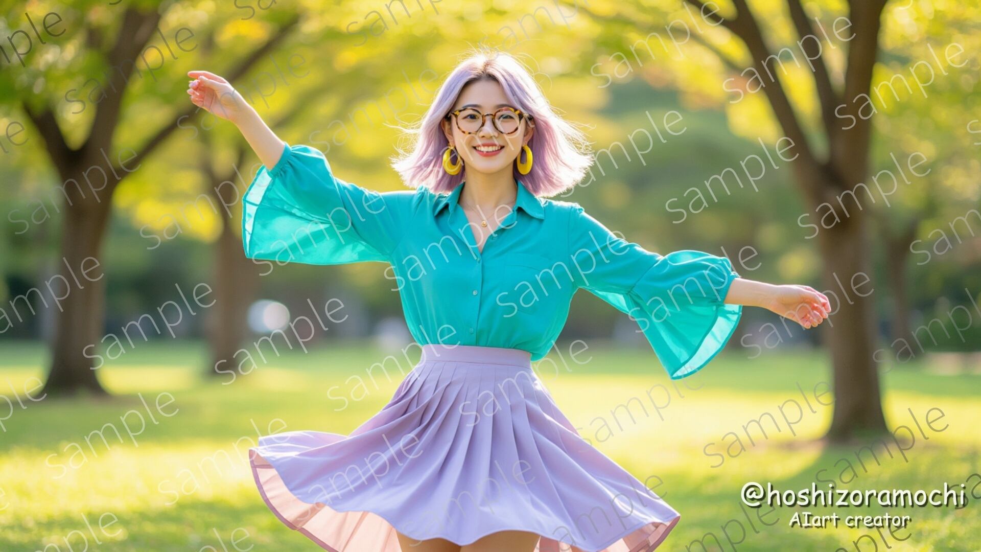 午後の公園、木漏れ日が斑点模様を作る芝生。べっ甲柄のラウンドメガネ、ラベンダー色の髪がふわりと浮く。ターコイズのフレアスリーブブラウス、コーラルピンクのギャザースカート、イエローゴールドのフープイヤリング。くるりと回転する途中、目を細めて笑う幸せそうな表情。純粋な喜びと自由を感じさせる光景。