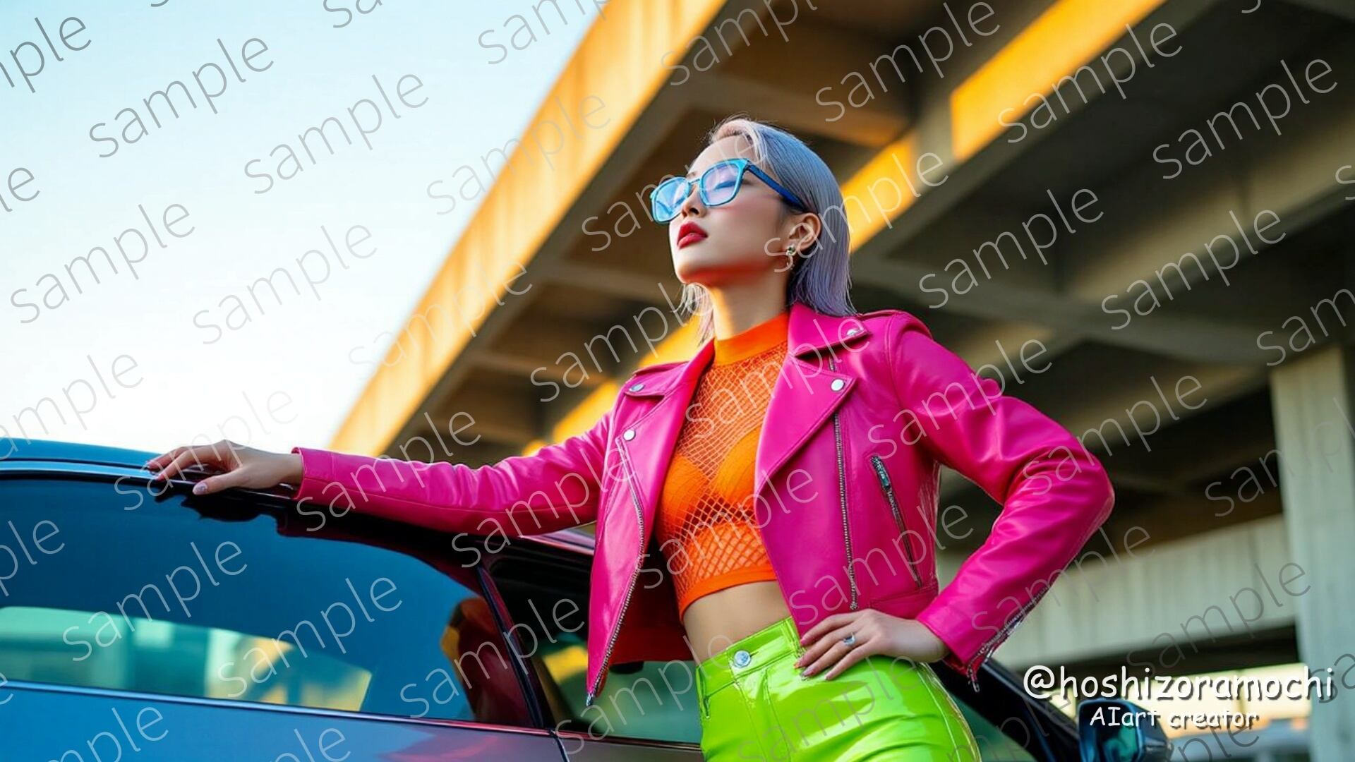 夕方、立体駐車場の屋上。細長いメタリックブルーフレームメガネ、プラチナとラベンダーのスリックヘア。ホットピンクのレザージャケット、タンジェリンオレンジのメッシュトップ、ライムグリーンのビニールパンツ。車のボンネットに手をつき空を見上げる。無機質なコンクリートと強い夕陽の光が、都会的でクールな雰囲気を創出。