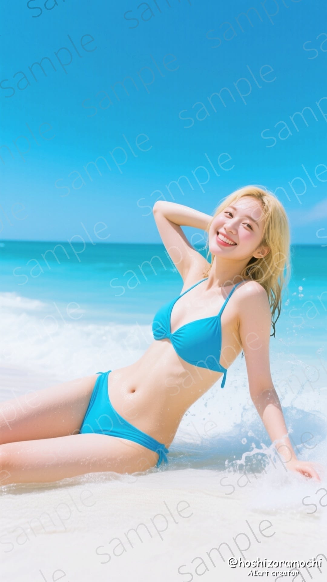 8. アズールブルーの誘惑、波間の戯れ:南国のビーチ。アズールブルーの海とビキニが、健康的な色香と開放感を強調。