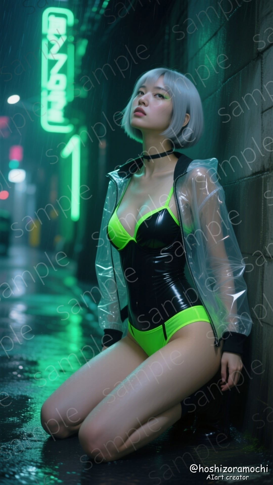 7. ネオングリーンの幻影、サイバーパンクドリーム:近未来的な路地裏。ネオングリーンが光るPVC衣装をまとい、クールな表情で佇む挑戦的な一枚。