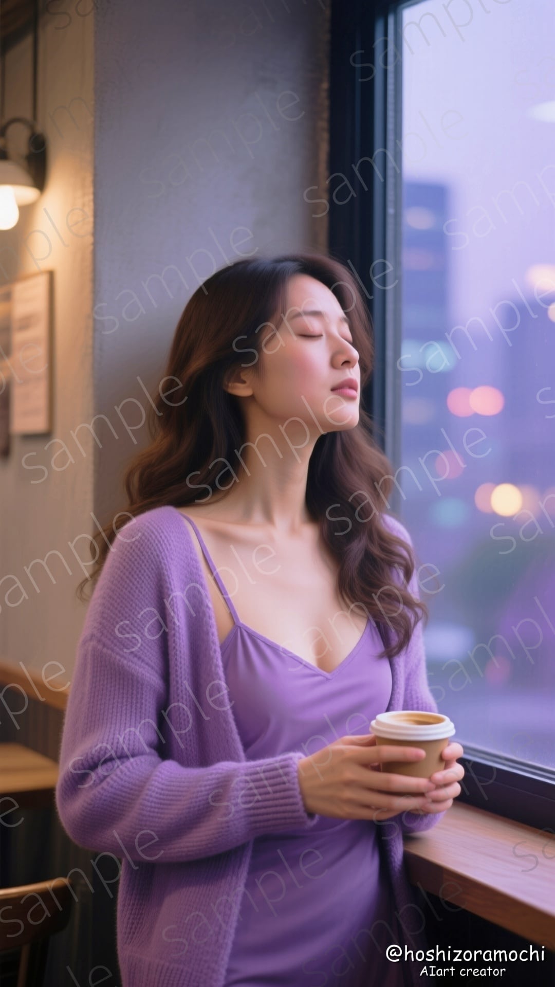 10. ラベンダーミストの誘惑、都会の隠れ家:夜の窓辺。ラベンダー色の柔らかなニットが、大人の女性の秘めた魅力を優しく引き立てる。