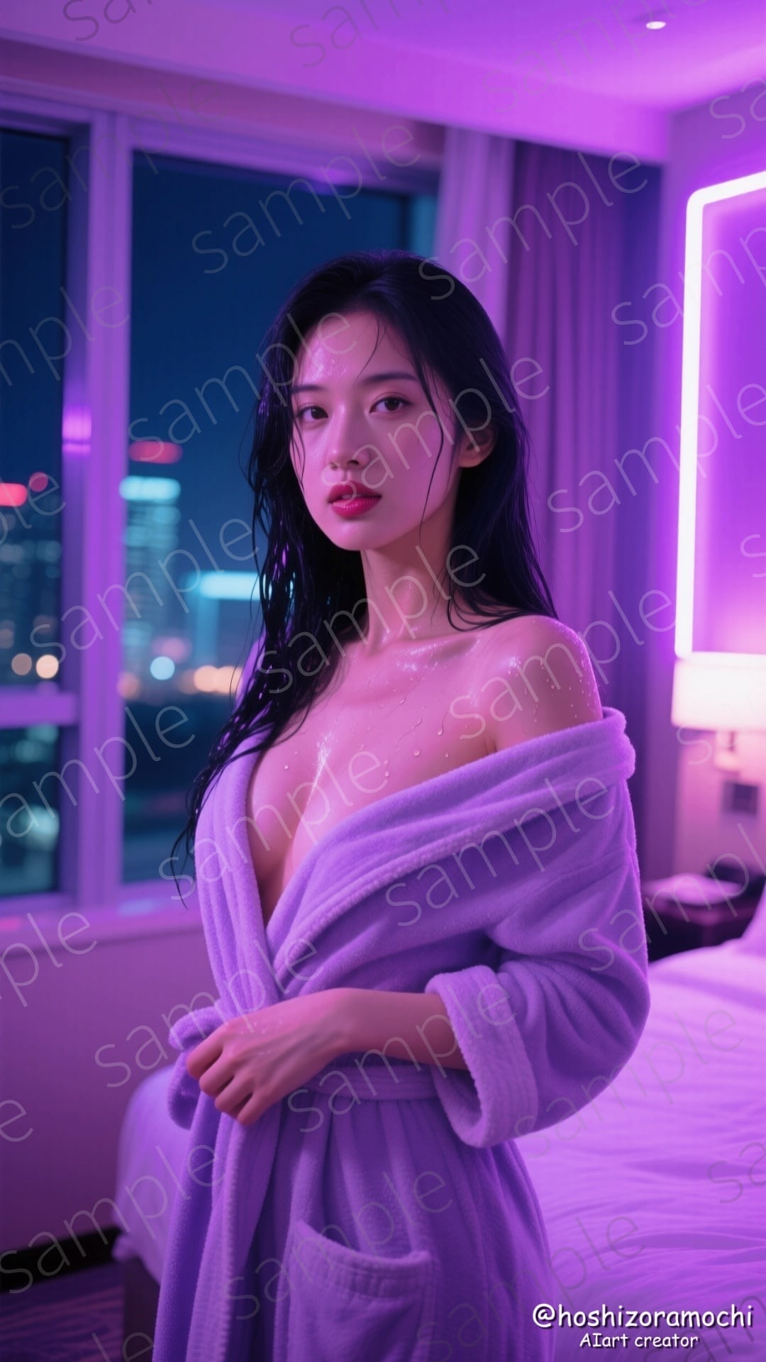1. 夢幻のパープルシャワー:深夜のネオンが薄紫色に光るホテルの一室。濡れた黒髪と、挑発的な視線が交錯する幻想的な瞬間。