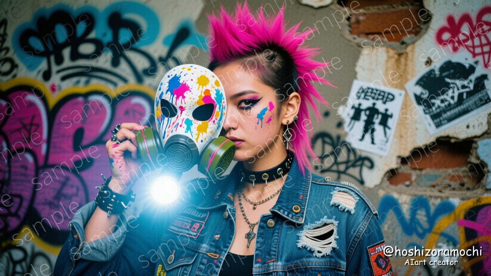 グラフィティとペイントまみれのガスマスク。パンクでエッジの効いたストリートカルチャー。