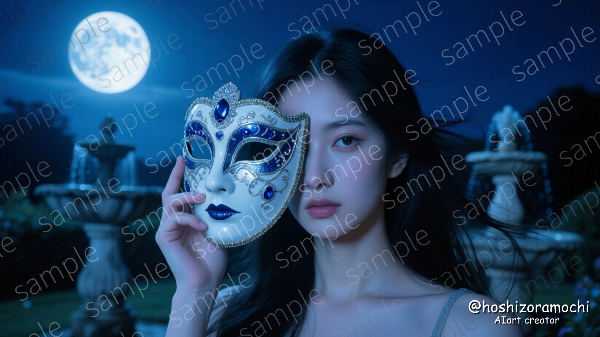 夜の庭園で月明かりに照らされながら、白磁のベネチアンマスクを手に持つ女性。ミステリアスで幻想的な雰囲気が漂います。