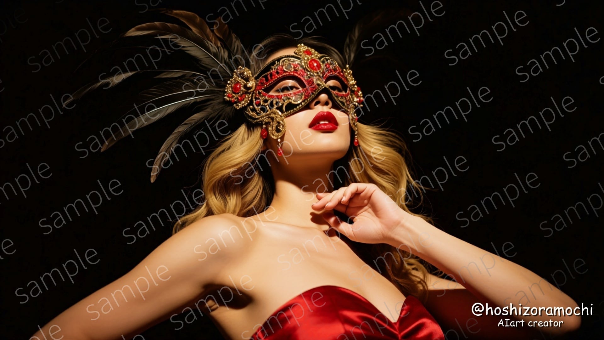 豪華な装飾が施された赤と金の仮面を被る女性。セクシーで大胆、高級感あふれる世界観。
