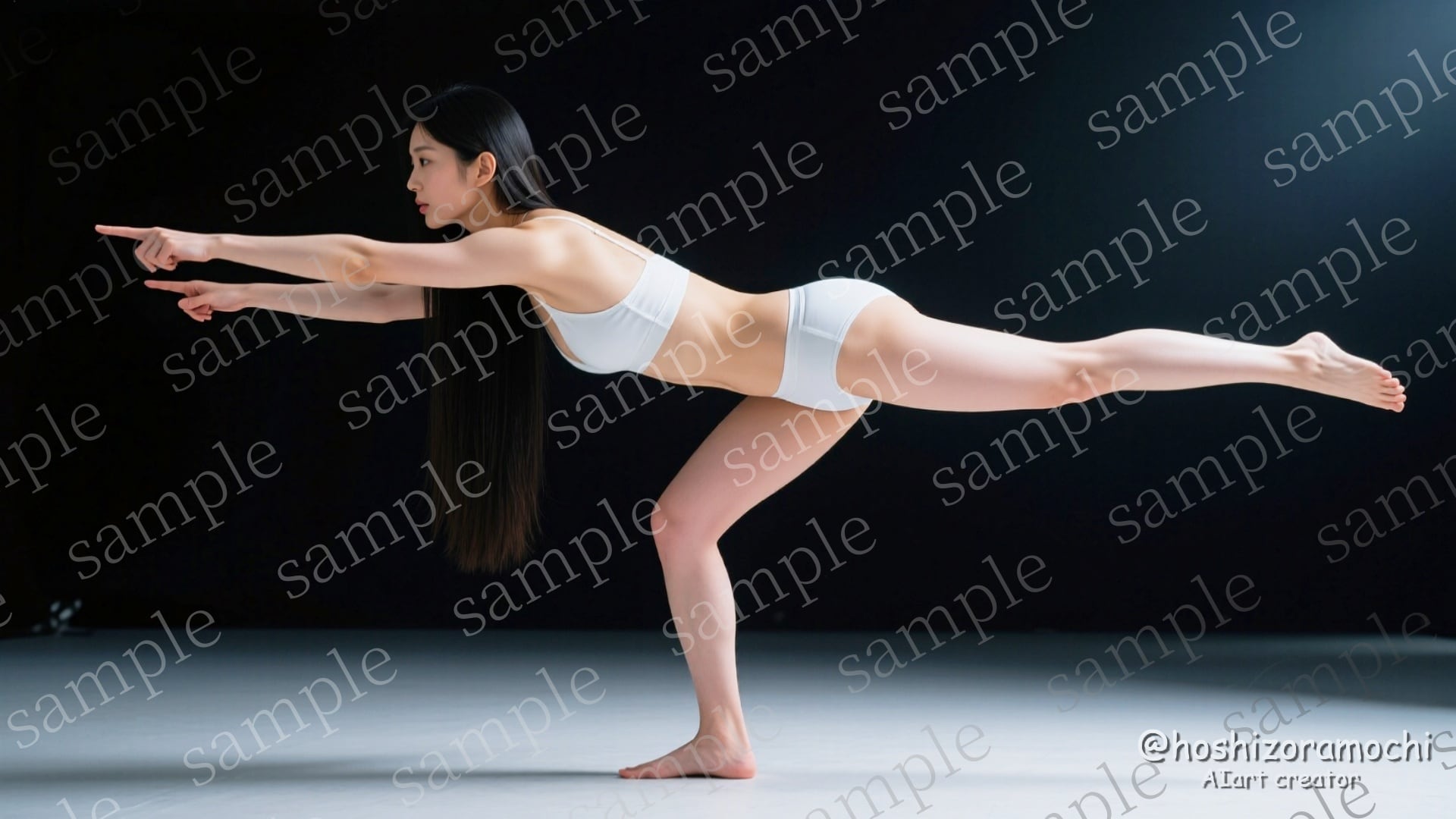 片足立ちでもう片方の脚を後方に水平に伸ばし、上体と腕を前方に伸ばすアラベスク変形ポーズ。身体全体が一本の線となり、無限へと続く道を描いています。完璧なバランスと前進の意志を表現した集大成の作品です。