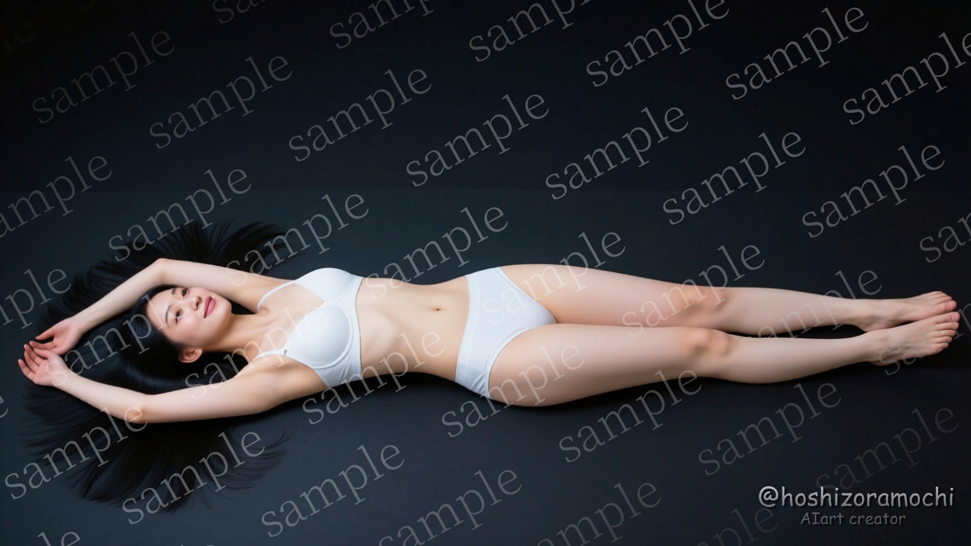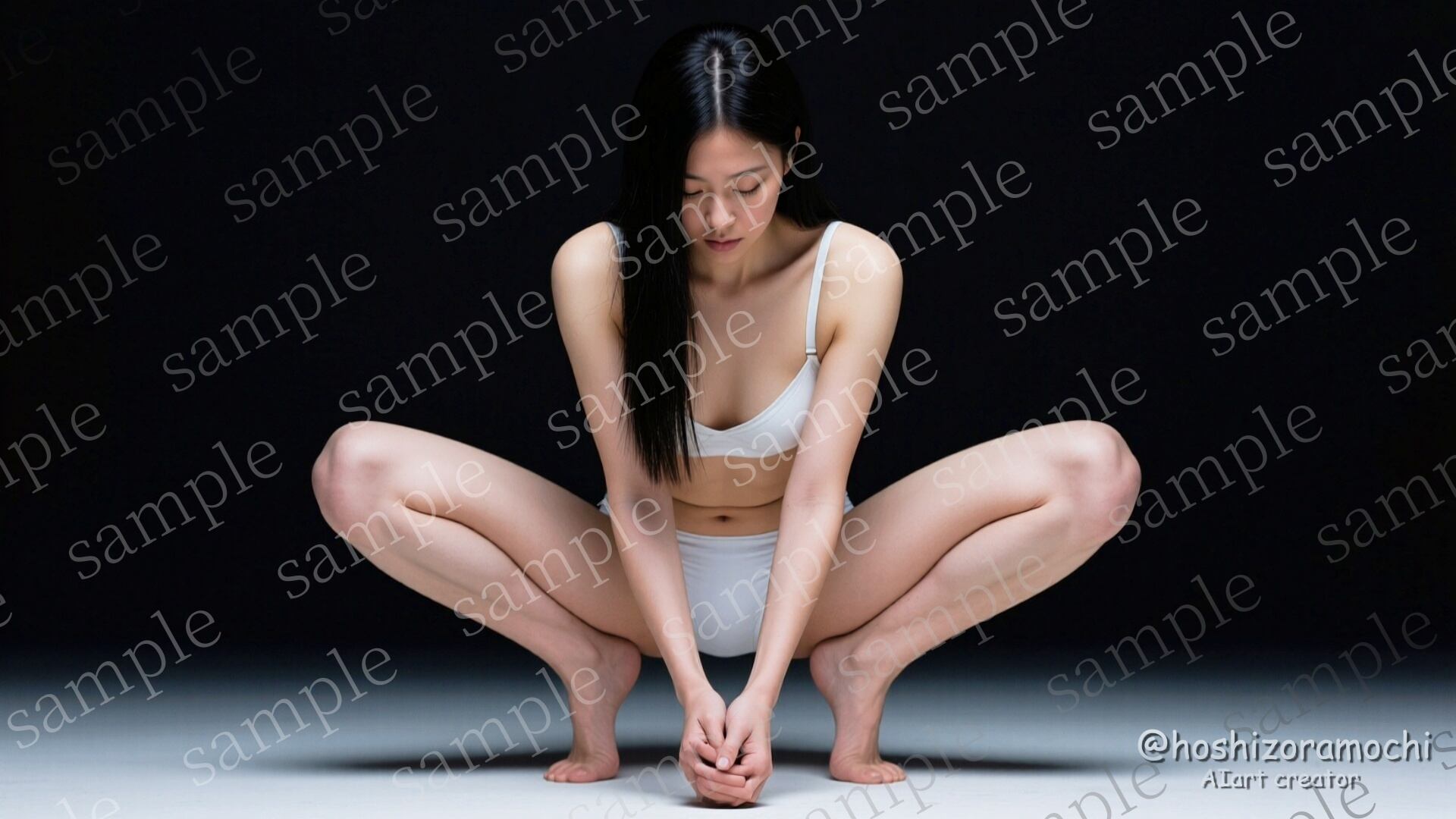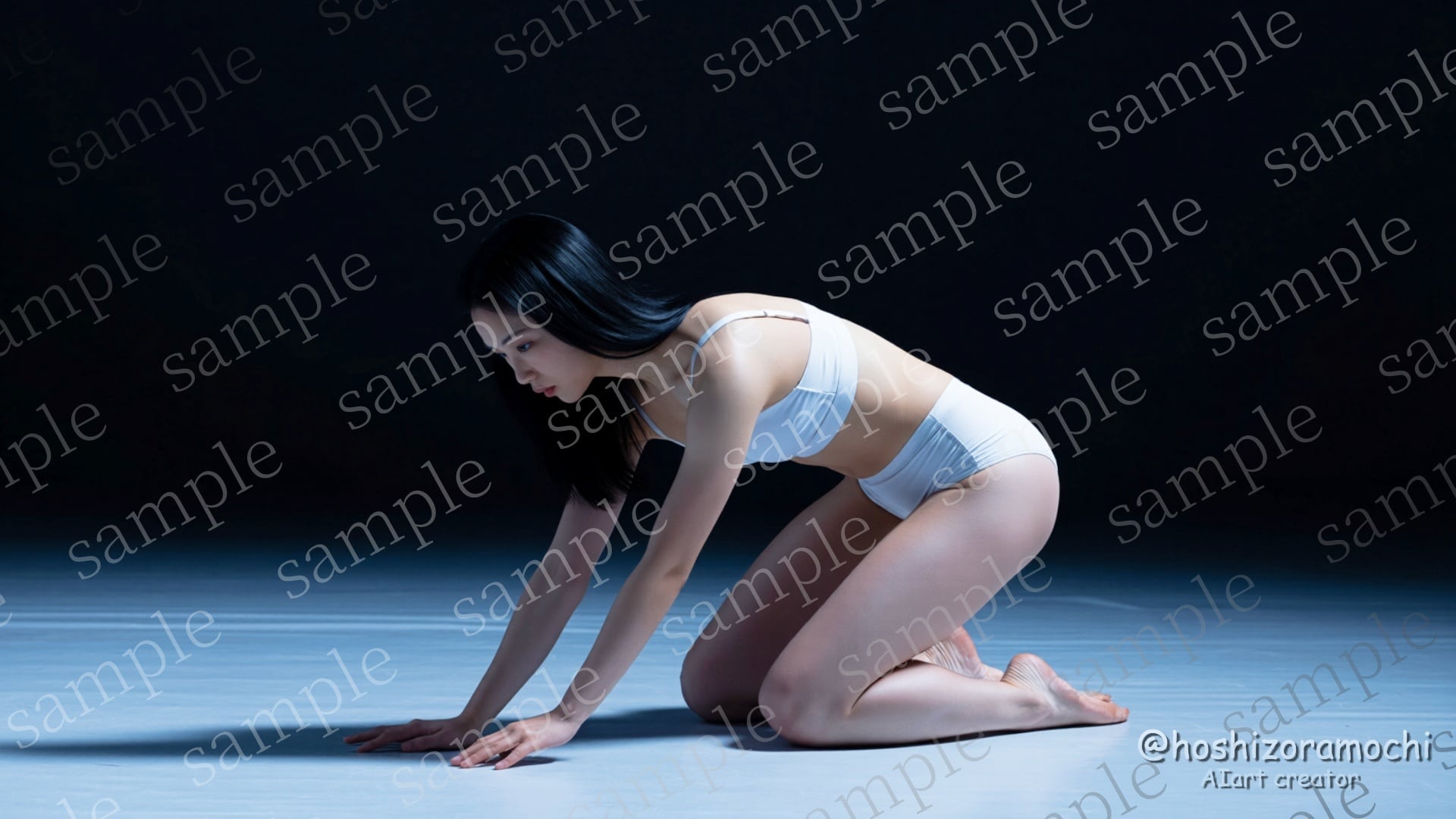 極限まで要素を削ぎ落としたミニマリスト・モダンスタイルで制作された、日本人女性のポージング画像素材集です。純粋な黒背景に白い下着を身につけた被写体が、10種類の多様なポーズで身体の美しさと感情を表現しています。