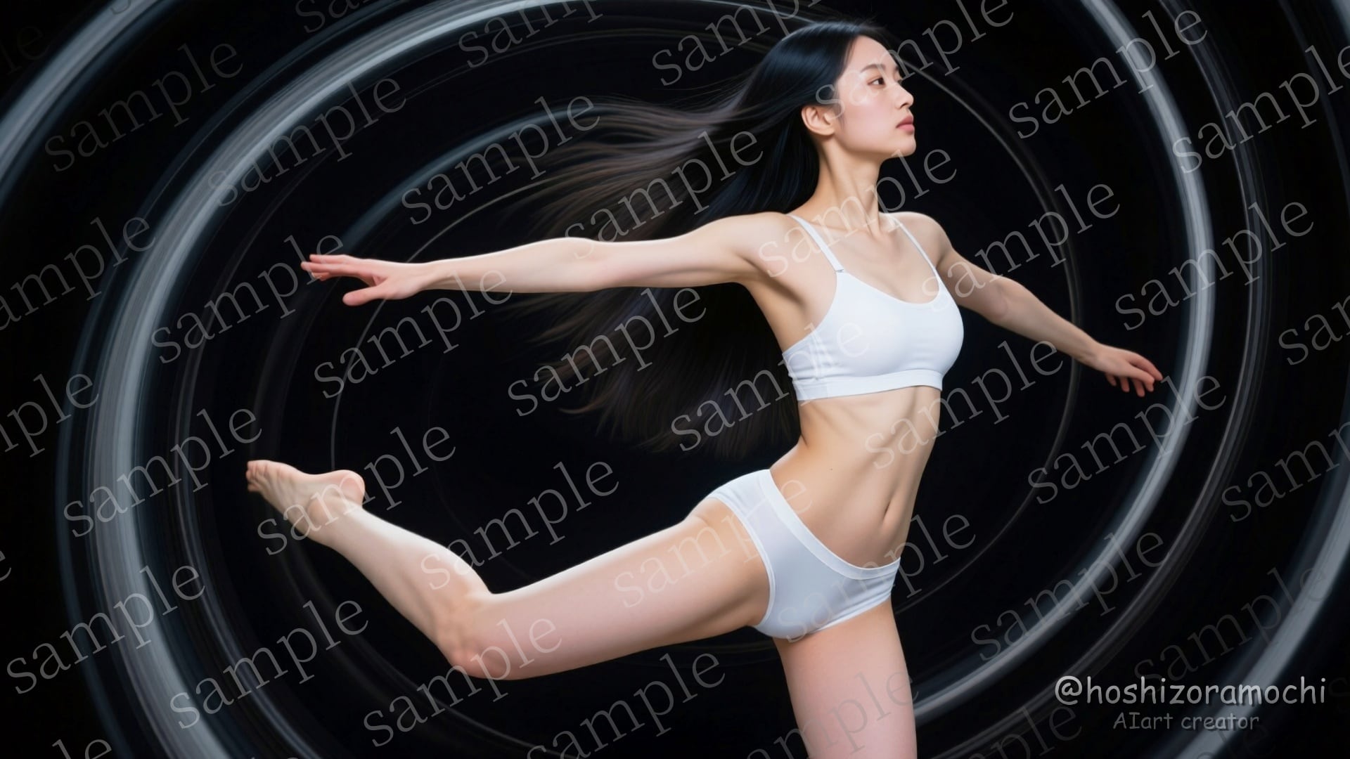 回転の瞬間を捉えた動的な作品。髪が遠心力で円を描き、身体の各部が異なる方向を向きながらも全体としての調和を保っています。静止画でありながら動きを感じさせる構図です。