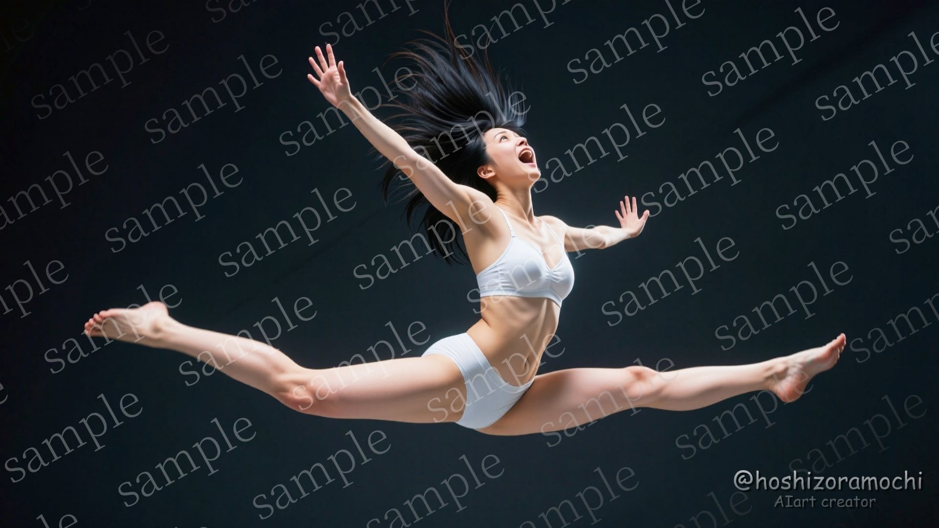 ジャンプの瞬間を捉えた躍動感溢れる作品。髪が重力に逆らって舞い上がり、身体は弓なりにしなり、表情は歓びに満ちています。完全な自由と解放を視覚化した一枚です。