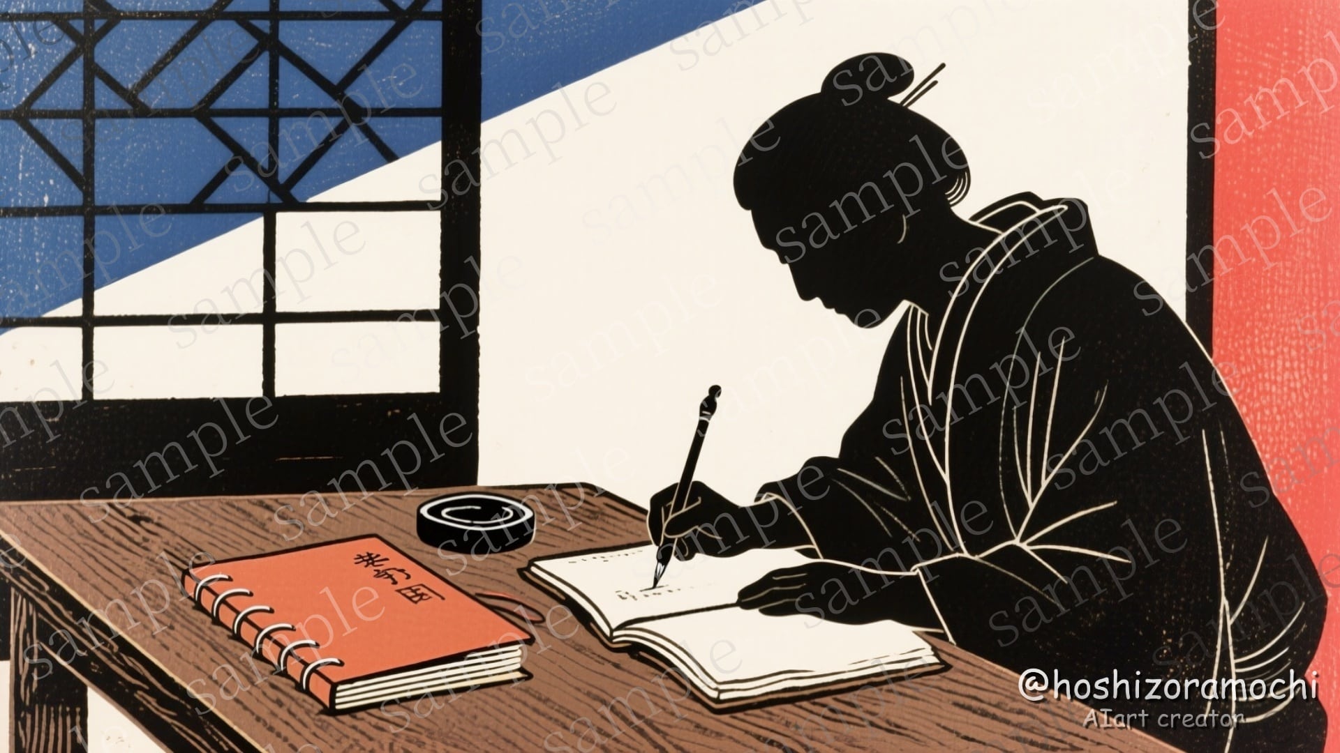 伝統的な木版画の技法で表現した和の情景。太い輪郭線と限定された色数で、和綴じの日記帳と硯、筆を配置しました。障子から差し込む光を幾何学的パターンで表現し、余白の美と日本的な美意識を大切にしています。木目の質感が重厚感を生み出します。