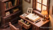 精巧なミニチュアで再現された書斎の一角。木製デスクの上には開かれた日記帳、メガネ、万年筆、スタンドライト、写真。引き出しからはみ出す押し花が、そこに暮らす人の物語を静かに語ります。マクロレンズで撮影したような精密なディテールと、ノスタルジックな雰囲気が特徴です。
