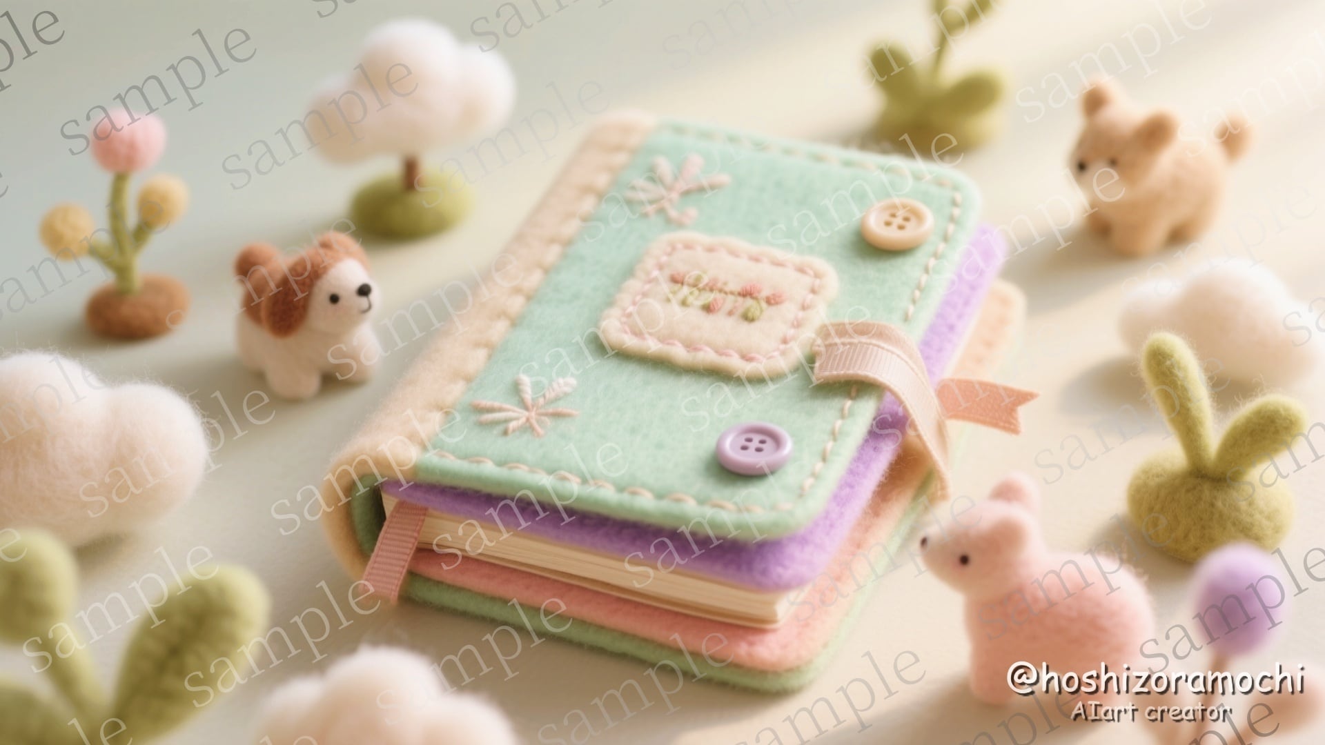 羊毛フェルトの柔らかな質感で表現した癒しの空間。様々な色のフェルトを重ねた日記帳の周りに、フェルトの動物や植物が優しく寄り添います。パステル調の穏やかな色合いと、繊維のふわふわとした毛羽立ちが、見る人の心を和ませます。