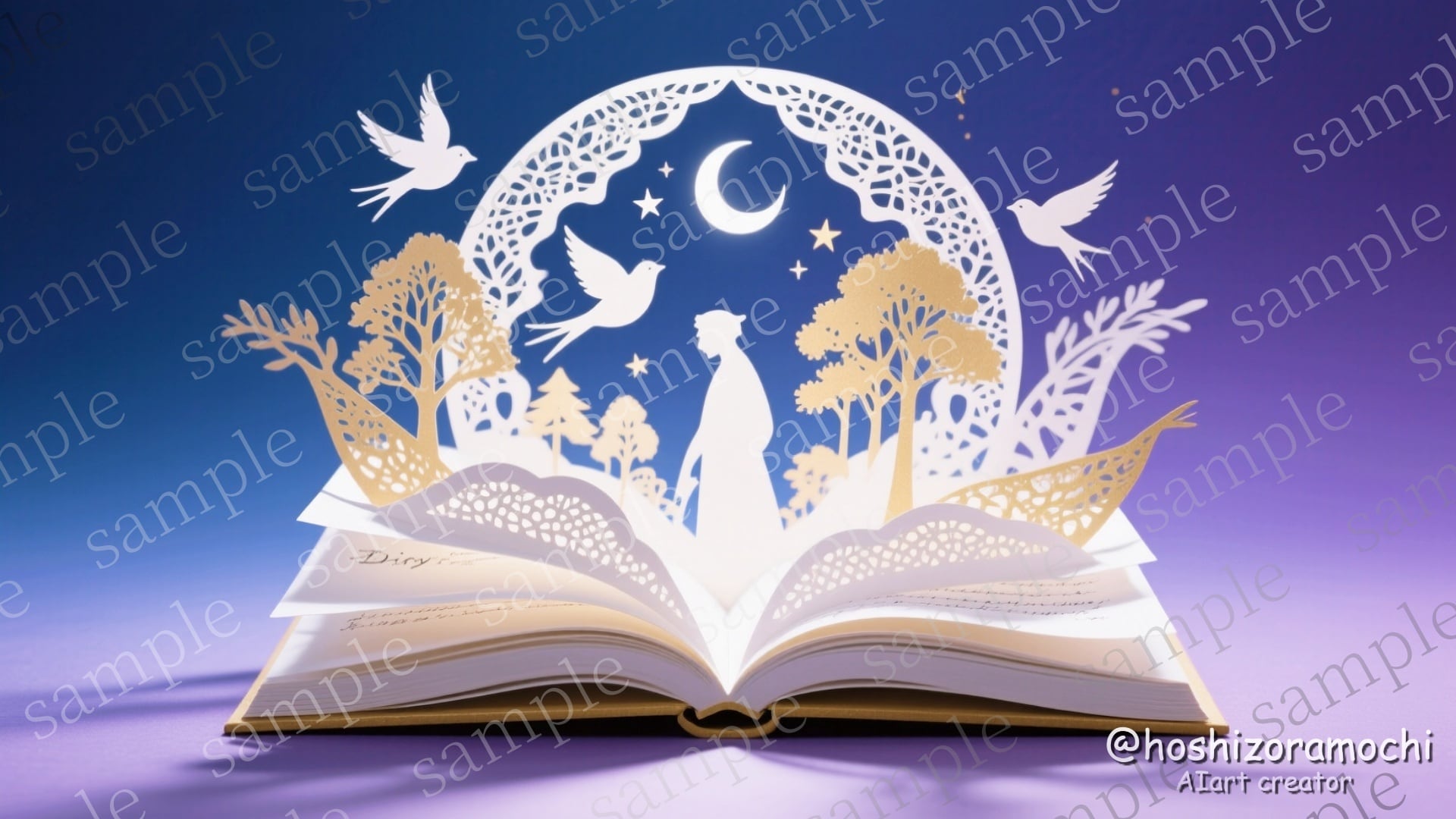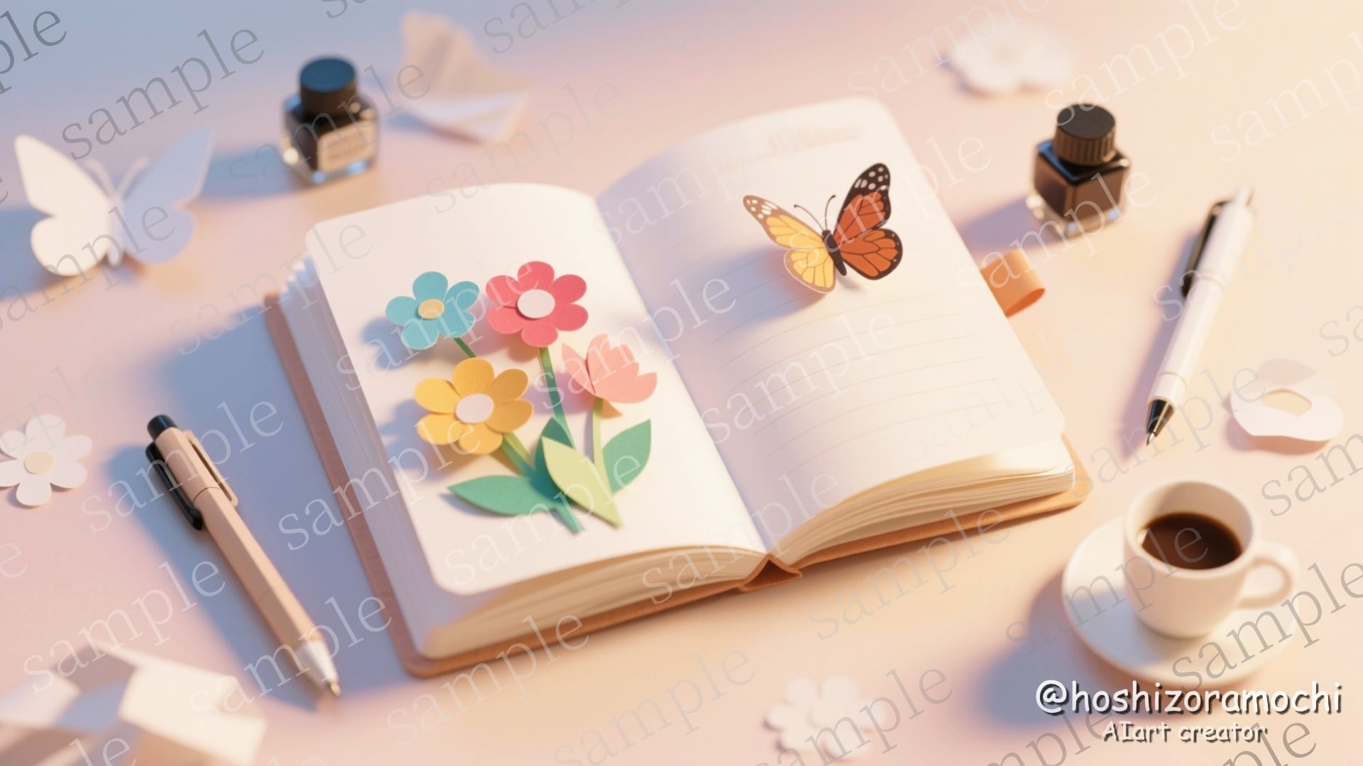 立体的な紙で作られた日記帳から、色とりどりの花や蝶が飛び出す様子を表現しました。ペーパークラフト特有の柔らかな影と紙の質感が、手作りの温もりを感じさせます。淡いパステルカラーが優しく、書かれた言葉が命を得て舞い上がる瞬間を捉えています。