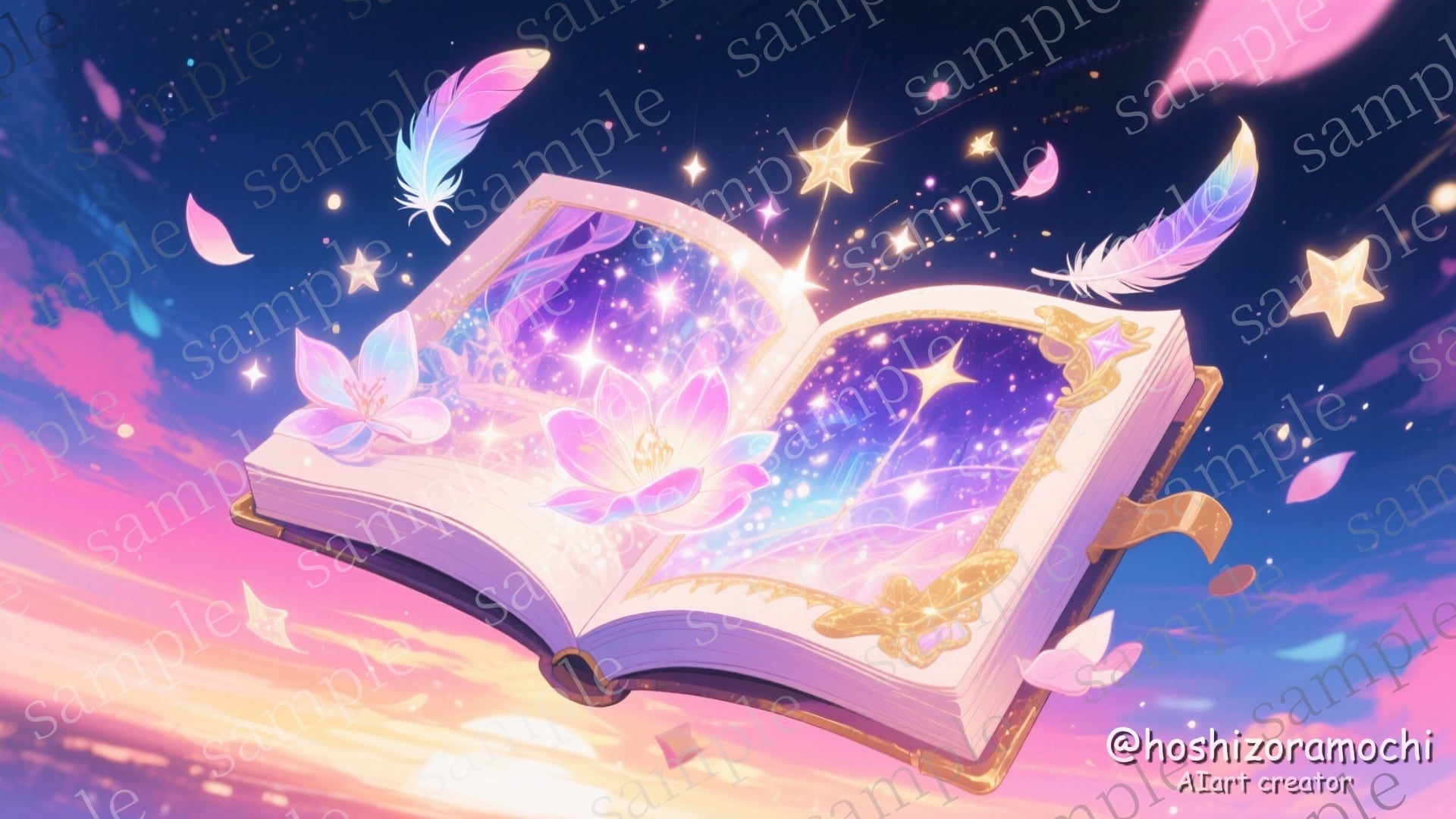 鮮やかなアニメタッチで、日記帳から思い出が浮かび上がる幻想的なシーンを描きました。光の粒子と共に舞う花びらや羽根、星のモチーフ。グラデーションの美しい空を背景に、記憶が蘇る瞬間の感動を視覚化しています。