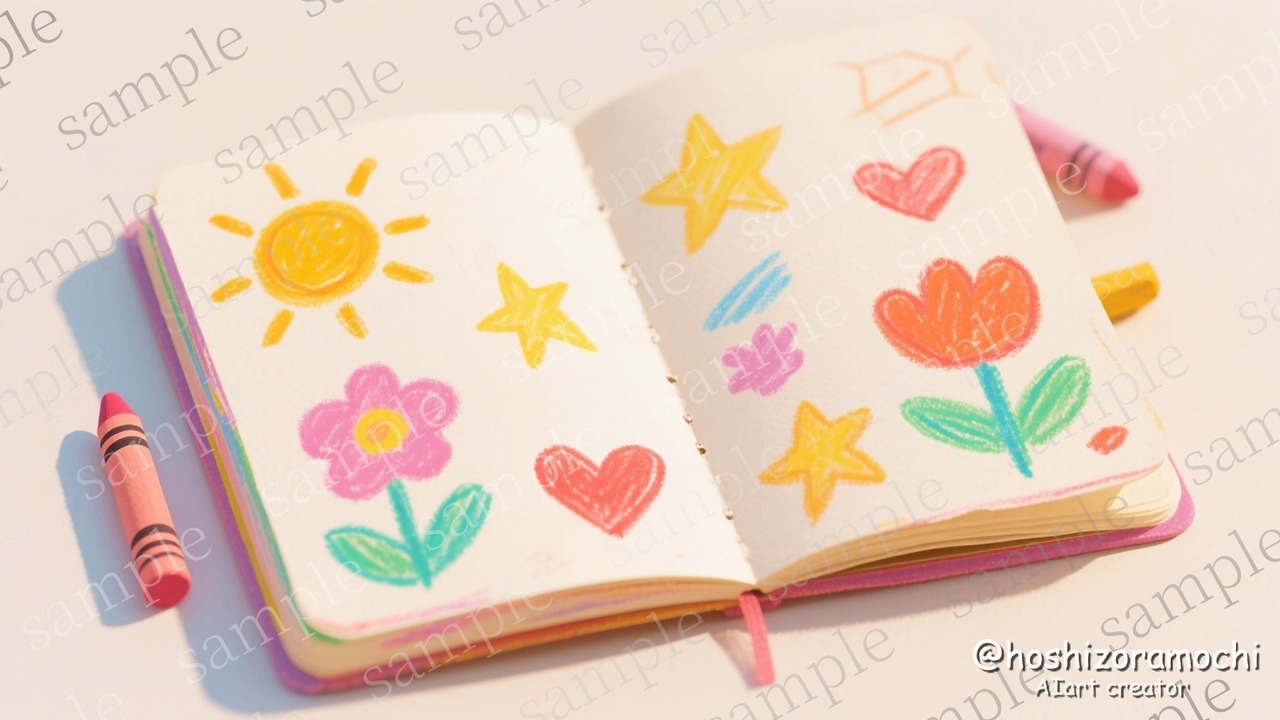 クレヨンで描いたような素朴で温かみのあるタッチ。太いストロークと塗りムラ、色の重なりが、子供の頃の純粋な創作意欲を思い起こさせます。明るく元気な色使いと、手描きの味わいが、日記を書く自由さと楽しさを表現しています。
