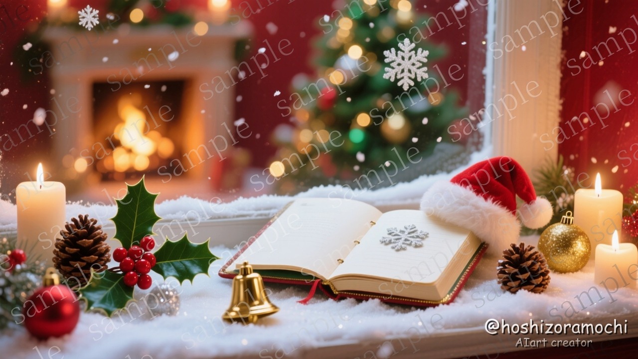 雪が積もる窓辺に置かれた日記帳を、クリスマスオーナメント、ヒイラギ、松ぼっくり、ゴールドのベルが飾ります。背景には暖炉の温かな光。一年の終わりを迎える季節に、振り返りと感謝の気持ちを込めて記録する、特別な時間を表現しています。