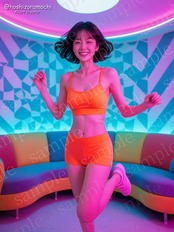 ネオンカラーのランジェリーを纏い、レトロな空間で遊ぶ女性。60年代のポップな色彩と遊び心溢れる動き。