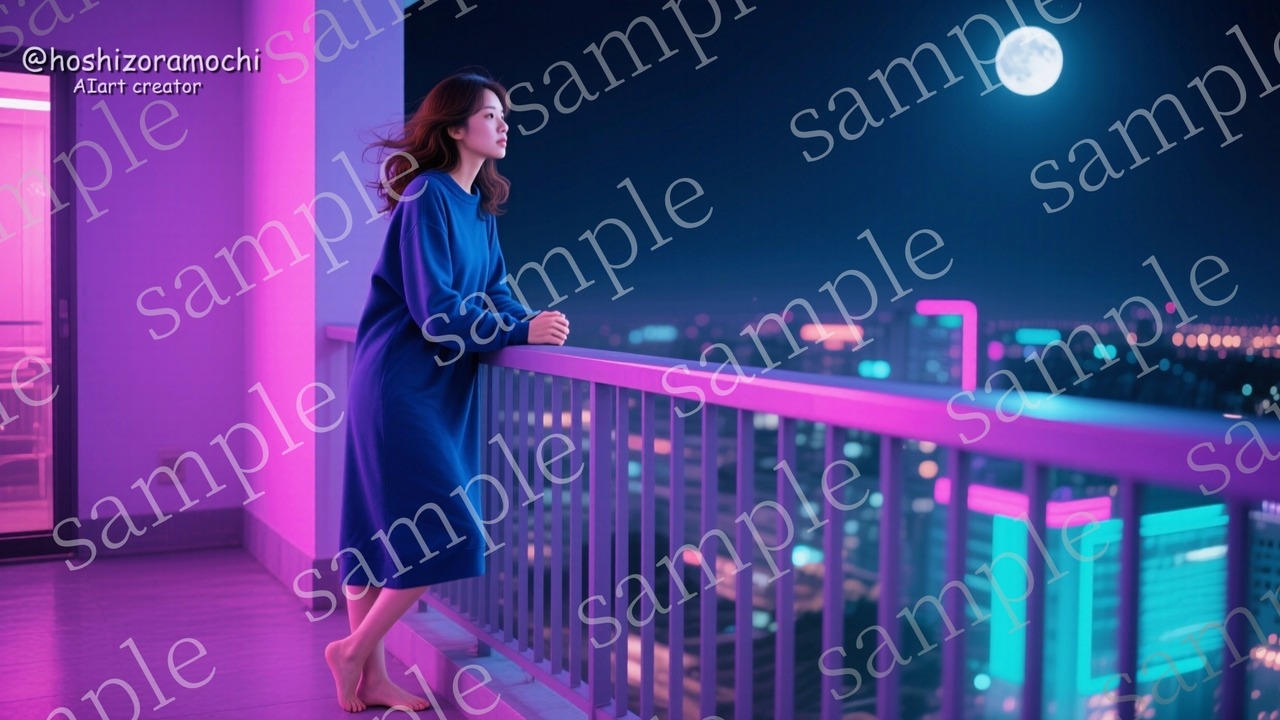 ストーリー:都会の喧騒から離れ、夜のベランダで内省に耽る知的な女性。孤独と美しさが同居する一枚です。