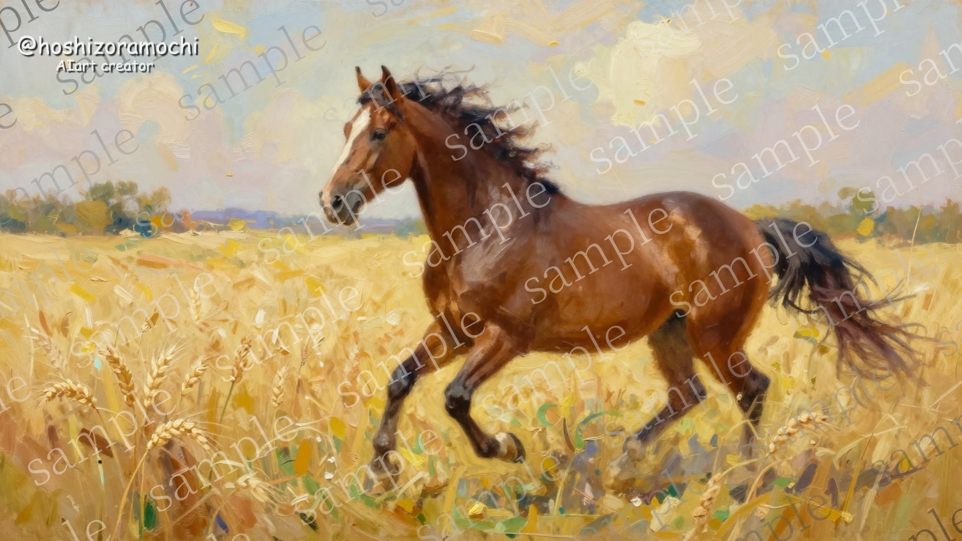 → 午後の陽光に照らされた麦畑を駆ける馬。印象派的な光の表現、暖色系の豊かな色彩。自由と開放感に満ちた作品。